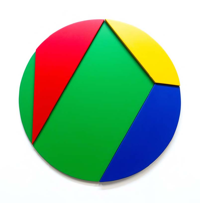 La série Focus, 2022-2023, nous propose des formes globalement circulaires qui évoquent des camemberts, ces graphiques circulaires en secteurs[6], que les statisticiens utilisent pour représenter visuellement des petites séries de données numériques. Leurs noms en trois lettres, Int, Goo, Oog, Ama ou Tal, n’aident guère à trouver leurs référents. Si Goo et Oog m’ont immédiatement évoqué le géant tentaculaire Google, et Tal le pétrolier TotalÉnergies, les autres m’ont laissé perplexe. Après un petit coup de pouce de l’artiste et un peu de recherche sur Internet, j’ai enfin pu associer Ama à Boursorama et Int à Nintendo… Ici, Clément Santos isole de nouveau le détail d’un signe mais, cette fois-ci, avec un cache circulaire pour, dit-il « essayer d’échapper au hors-champ que suscite souvent le cadrage rectangulaire photographique[7]. » Le mot Focus évoque aussi la focalisation, la mise au point, le réglage d’un appareil photographique ou la concentration de l’attention d’une personne sur un sujet particulier, parfois sur un détail. Les titres des pièces, dans une démarche constante chez l’artiste, sont aussi des manipulations sur le nom de la marque commerciale évoquée, n’en retenant que trois lettres consécutives, reflet linguistique de l’opération plastique. L’intention avouée de l’artiste n’est pas que le regardeur découvre spontanément le signe initial. Il lui souhaite même de « s’en protéger pour préserver un regard ouvert[8]. »