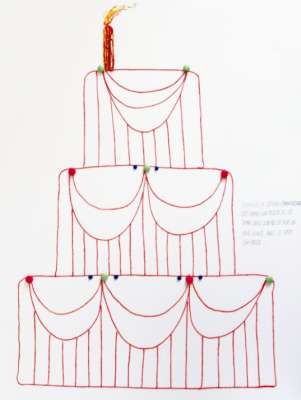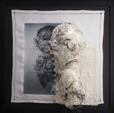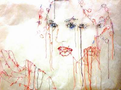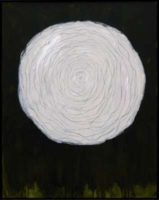 Élisabeth Baillon brode. Elle privilégie des rythmes concentriques sur des fonds blancs qu’elle travaille avec des jus d’encres colorés ou des collages. Elle les gratte, les griffe, tels des tatouages, puis les brode, les borde, les délimite, les enchâsse par la chaînette.
