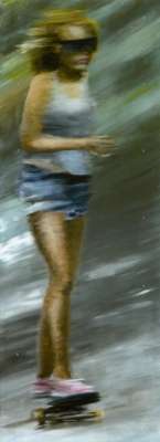 Ses thèmes de prédilection sont tirés de la vie quotidienne et majoritairement urbains : passants, piétons, véhicules, métro… Elle aime suggérer la vitesse et le mouvement en donnant à ses figures un aspect flouté.