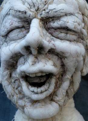 Les sculptures et les peintures d’Anne Bothuon ont en commun le fil, le tissu et l’aiguille. Ses sculptures, un peu plus grande que nature, sont réalisées en toile de coton, en feutre et en ouate, sur des armatures de fer, le fil creusant, resserrant les chairs, mais aussi dessinant le contour d’une bouche, la forme d’un œil. Ses corps transpercés, ficelés, ligaturés, évoquent des écorchés dans un laboratoire d’anatomie. Ils sont figurés sans complaisance, obèses, callipyges, avec des bourrelets disgracieux, des seins tombants… Aux antipodes des canons d’une beauté que les médias veulent imposer.