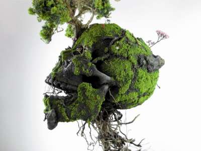 Le travail d’Émeric Chantier a des affinités avec celui de la maquette ou de la miniature. Il évite cependant le double écueil d’une figuration qui risquerait de devenir décorative et d’une narration qui pourrait sombrer dans l’anecdotique. Il utilise des objets de récupération, des lichens stabilisés et des fleurettes séchées, collectées dans le maquis corse puis peintes, pour réaliser des assemblages minutieux, des petites compositions oniriques : un crâne, un cœur ou une voiture en cours de végétalisation…