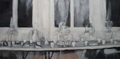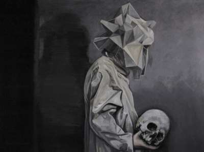 Les huiles récentes d’Olivier Poizac sont peintes dans des camaïeux de gris. Certaines copient des images tirées de la presse, telle cette automobile en feu ou ce bus couché sur le flanc. D’autres représentent des objets ordinaires de la vie courante, comme cette paire de baskets délaissée. D’autres encore relèvent de la vanité, tel ce corbeau sur la poitrine d’un pape mort ou ce rat perché sur une couronne impériale abandonnée.Les plus fascinantes et déroutantes se trouvent cependant dans sa galerie de portraits incongrus. Dans l’un, un Hamlet dont la tête est remplacée par un polyèdre irrégulier contemple le crâne de Yorick. Ailleurs, une femme dotée d’un masque à gaz, les seins lourds, est qualifiée de louve. Dans un autre, un vêtement vide a conservé la forme de la femme qui le portait. Plus loin, des portraits de familiers nous montrent des sujets tournant le dos au spectateur ou cachant leur visage dans leur chevelure.