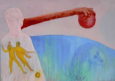 Les compositions d’Edgar Manuel Marcos évoquent une identité en quête de son affirmation. Les personnages sont sans visage, portent des masques ou se dédoublent de façon imparfaite. Tous ont perdu une partie de leur corps dans un exercice qui relève de la déconstruction suivie d’une reconstruction inachevée, imparfaite, comme suspendue. Ses personnages ne semblent pas souffrir de cet état instable, proche du vacillement. Ils sont fragmentés mais non torturés, la douceur des couleurs interdisant d’ailleurs toute évocation de peine ou de douleur.Ce que l’artiste veut nous dire, c’est que nous vivons dans un monde en éternelle suspension, transitoire, éphémère, illisible, rempli de doutes, au devenir incertain, près de basculer à tout moment du côté du meilleur ou du pire.
