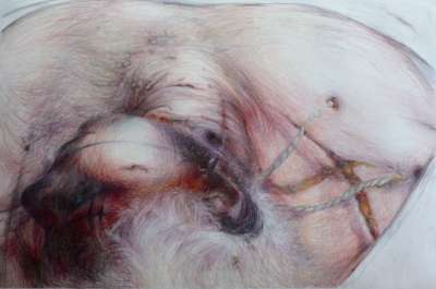 Depuis 2010, Emmanuelle Mason travaille sur des séries intitulées Natures mortes, dans lesquelles elle mélange des photographies de petits animaux morts glanés au quotidien, des dessins à l’encre et des impressions numériques. La tension graphique de ces compositions semble donner vie à de la chair morte, à ces animaux qui se présentent comme des allégories de gisants, des métaphores de notre propre mortalité.Ces œuvres tiennent à la fois de la vanité et des peintures rupestres des hommes préhistoriques. Elles sacralisent l’animal qui incarne et représente la nature. Emmanuelle Mason réagit ainsi à la distance que la vie contemporaine a mise entre l’homme et l’animal, désormais réduit au contenu de barquettes sous blister dans les rayonnages de supermarchés.
