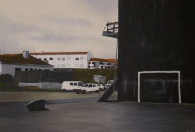 Concepteur de décors pour le théâtre et illustrateur, Jean-Diego Membrive découpe des gouaches de couleurs vives et les recompose avec une volonté de monumentalité qui évoque l’architecture moderniste. À l’opposé, ses peintures sur toile résultent d’un processus d’exécution long et attentif. Leur spectre chromatique est étroit : blancs, bleus éteints, terres d’ombre, ocres… Ce sont des portraits de ses proches, traités sur des fonds neutres hérités de la peinture espagnole. Ses personnages semblent installés sur une scène de théâtre désaffectée, en souffrance de décor. Ils sont plongés dans des réflexions qui ne peuvent être qu’existentielles. Dans ses toiles, Jean-Diego Membrive renouvelle, à sa façon, la pratique des memento mori…