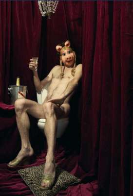 Sous le masque de Peggy la cochonne, il se met en scène, nu, dans des dispositions improbables qui évoquent cependant les compositions de la grande peinture baroque. Le masque reste le dernier rempart face à une réalité dont l’artiste tente, sans illusion, d’arrêter le cours. Un sursaut salutaire mais désespéré avant la dissolution définitive.