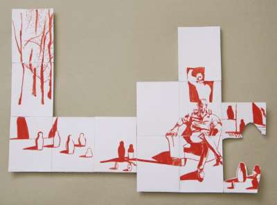 Élodie Lemerle s’intéresse à la banalité de ce qu’elle appelle les petites figures du quodidien. Elle collecte chaque jour des images, çà et là, dans la presse, choisissant des sujets neutres et ordinaires. Elle les déchire, les découpe, les froisse et les associe par collage sur des feuilles jusqu’à ce qu’elles prennent un sens autre. Dans une seconde phase, elle les peint ou les dessine, souvent dans des camaïeux de gris. On trouve, dans la démarche d’Élodie Lemerle, une curieuse combinaison d’un ancrage dans le réel et d’une prise de distance, d’une forme de défiance, par rapport aux images qu’en donne la presse. On peut aussi y voir une réflexion – à moins que ce ne soit un acte de dérision – dans le questionnement de ce qu’apporte une image peinte ou dessinée par rapport à une photographie.