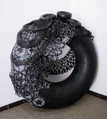 Depuis quelques années, Amandine Meunier travaille à partir de chambres à air usagées, qu’elle découpe et transforme pour produire des œuvres qui ont pour caractéristique commune d’évoquer le déplacement, le voyage, les frontières, le nomadisme…En un temps où la chambre à air a été détrônée par le tubeless, son recours à ce produit devenu inutile devient un acte de protestation contre l’uniformisation mécanique des formes issues du monde de la production industrielle de masse. Il en est de même de son incessante recherche d’imperfections manuelles qui oppose industrialisation et artisanat. On peut aussi voir, dans sa démarche, une réflexion sur le processus de création de valeur : comment créer de la valeur esthétique en recyclant un produit qui n’en a guère ?