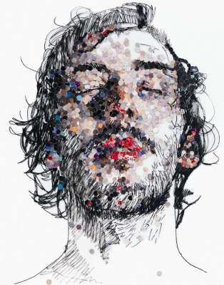Ced Vernay est un artiste pointilliste. Mais, le point ayant disparu, remplacé par le pixel, il s’est fait artiste pixelliste. De fait, ses pixels sont des confettis obtenus en découpant des magazines avec un emporte-pièce. Essentiellement portraitiste, il part d’une photographie d’une personne connue, d’un proche ou d’un anonyme, la met au carreau puis, minutieusement, reconstitue l’image initiale en collant les petites pastilles sur la toile. Ced Vernay est indéniablement coloriste, mais sa palette est une boite de confettis et son pinceau une pince à épiler… Tant de minutie, de patience et de méticuleuse précision pourraient faire craindre un résultat dans lequel la technique prime sur l’expression. Il n’en est rien, à l’instar des œuvres de ses grands devanciers en pointillisme, ses pointilleux efforts donnent à ses portraits une présence vibrante qui relègue la prouesse technique au second plan.