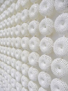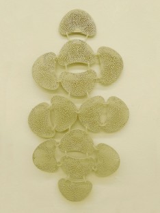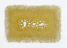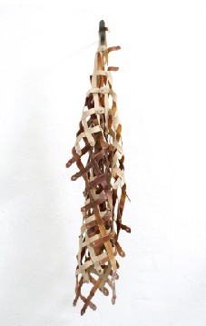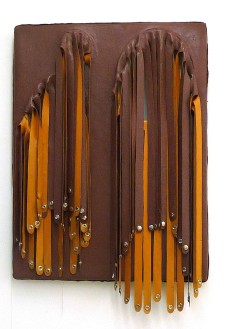 Née en Algérie en 1980, Maya Benkelaya a été formée à l’École nationale supérieure des beaux-arts de Paris. Ses œuvres – dessins et sculptures – mettent en scène le corps humain, mais en ne le faisant jamais figurer explicitement, procédant plutôt par allusions ou par métaphores. Elle use ainsi de subterfuges transposant l’anatomie dans des formes improbables, absurdes ou inconfortables, mais toujours identifiables. Peut-être peut-on y voir une façon de contourner l’interdit de la figuration des êtres vivants dans la tradition islamique[2]. Ce refus de la représentation directe n’exclut pas une forme de voluptueuse sensualité, faisant écho au propos de Marguerite Yourcenar : « Qu’est la volupté elle-même, sinon un moment d’attention passionnée au corps ? »[3]     Plus encore qu’au corps, c’est à sa frontière avec le monde extérieur, à la peau, que l’artiste porte son attention la plus passionnée. Le latex est un de ses matériaux de prédilection. Il peut se répandre au sol, comme une flaque délimitée par une fragile bordure, pendre au mur en lanières sages ou déchiquetées, constituer des torsades en forme de tresses. Il est souvent accompagné de boutons pression pour souligner le fait qu’il s’agit bien d’un matériau qui a pour vocation de se refermer, de mouler pour mieux envelopper[4]. Mais cet enfermement suggéré n’a rien d’un emprisonnement. On dirait que Maya Benkelaya veut prendre le contre-pied de Schopenhauer quand il déclare : « Chacun est enfermé dans sa conscience comme dans sa peau. »[5] Au contraire, ses œuvres délivrent l’imagination et la conscience qui, libérées de toute représentation trop explicite, peuvent s’égarer dans des chemins non balisés qui n’ont rien de contraint ou de prédéfini. On pense à l’expression « Esclave de corps, d’esprit libre. »[6] de Sophocle. Et c’est bien de cela qu’il est question. La peau, telle une mue, est restée sur place. Son habitant s’est échappé, a pris une liberté que le spectateur est libre d’imaginer comme il l’entend.     Que dire de ces dépouilles qui nous interpellent comme seuls témoins de probables mauvais traitements : écorchements renvoyant à Marsyas ou à saint Barthélemy, tortures individuelles comme dans La colonie pénitentiaire de Kafka, lacérations sadiennes, raffinements cruels et voluptueux dignes du Jardin des supplices de Mirbeau… ? Elles renvoient à une réflexion sur la précarité de l’écorce humaine. Ce point est corroboré par le fréquent recours de l’artiste à des équipements médicaux, orthopédiques ou sportifs rendus presque anodins par leur transformation en thèmes de contemplations esthétiques. Ils sont multipliés, assemblés, déformés, étirés pour créer des objets ou des installations qui forcent le regardeur à repenser le rapport de son propre corps avec le monde environnant. Les sentiments se bousculent, s’entrechoquent et se contredisent : contrainte, obstacle, abandon, résignation, libération, souffrance… Mais, comme le soulignait Shakespeare : « Plus le corps est faible, plus la pensée agit fortement. »[7]     Une des caractéristiques essentielles de la peau est sa semi-perméabilité. Maya Benkelaya la met en évidence dans ses dessins qui se présentent, le plus souvent, comme des assemblages frontaux de surfaces opaques partiellement ajourées, à des tissages, à des cuirs corroyés ou à des damasquinures. On pense inévitablement au travail artisanal de l’art populaire kabyle, à ses poteries peintes – les ikoufans –, à ses peintures murales, à ses bijoux et à ses tatouages, subsistance d’une lointaine écriture primitive remplie de symboles sexuels. Ces dessins arrêtent le regard tout en ménageant des sorties, vers le fond de la feuille, sorties sans issue. Ils se laissent pénétrer par l’œil, mais le captivent, le capturent et l’empêchent d’en ressortir, incitant à une certaine forme de voyeurisme. Ils se comportent ainsi comme des moucharabiehs[8], surfaces semi-perméables et asymétriques par excellence – voir sans être vu –, variantes des vitres sans tain, alimentant bien des fantasmes voyeuristes repris, notamment, par Duchamp dans son Étant donnés : 1° la chute d’eau 2° le gaz d’éclairage… Louis Doucet, janvier 2014