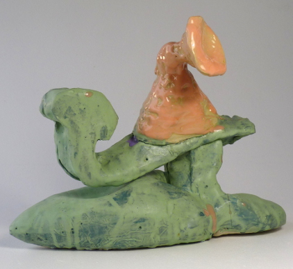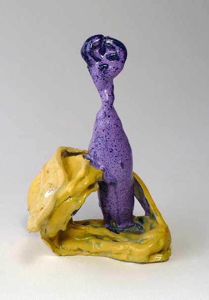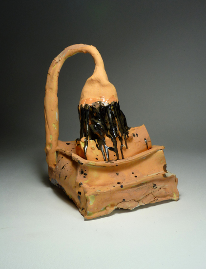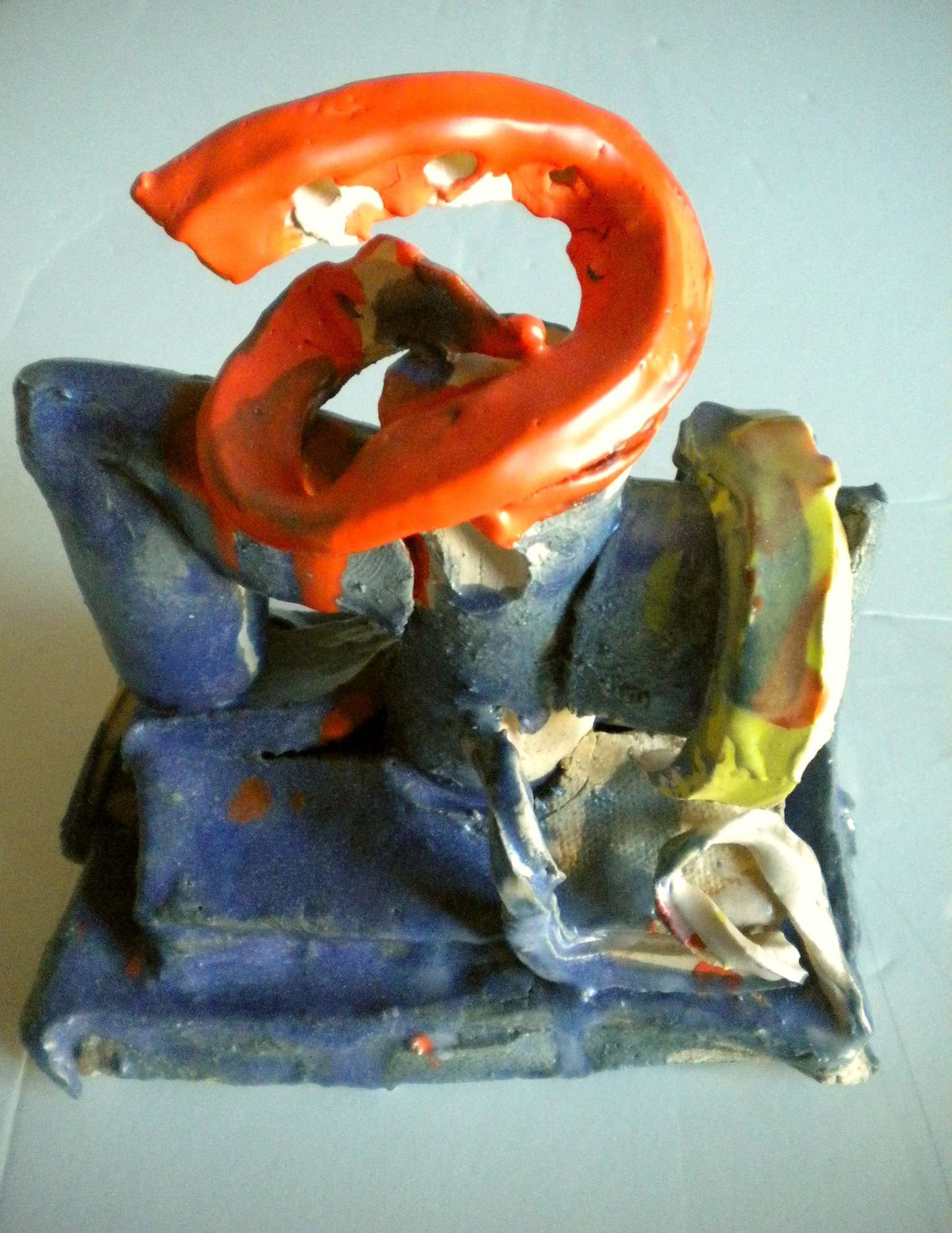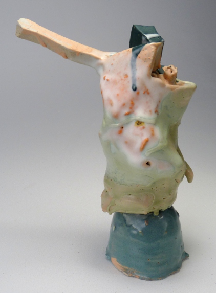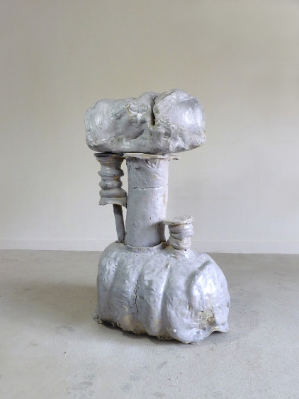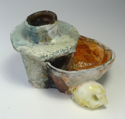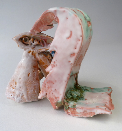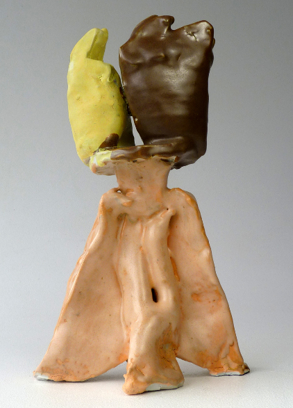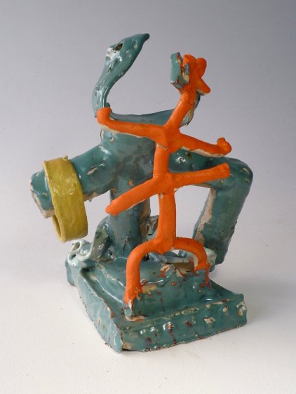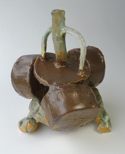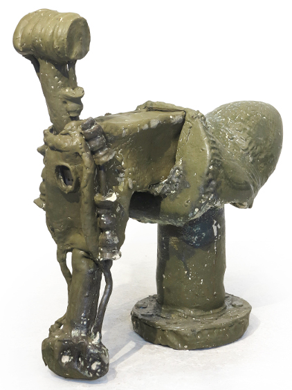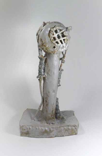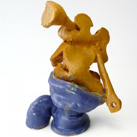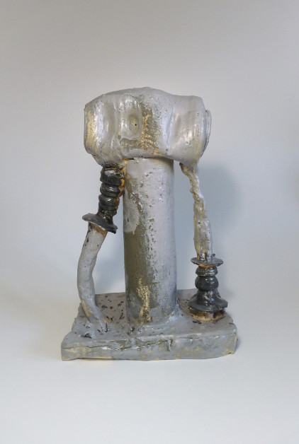Dans ses œuvres de petit format, à la taille de son four à céramique et, donc, réalisées en une seule pièce, Patrick Crulis s’est d’abord intéressé à la relecture de quelques grands classiques de l’art du XXe siècle. Au Grand verre de Duchamp, il empruntera ses Moules mâlics, croquemort, policeman et prêtre, 2013, et sa Broyeuse de chocolat, 2013, à Picasso son Verre d’absinthe, 2011, et sa nature morte Vase, bol et citron, 2011, à Schnabel son Mutant King, 2014… De ce point de vue, sa démarche est quelque peu comparable à celle d’Oldenburg transposant une sculpture de Picasso en une structure molle, si ce n’est que, chez Patrick Crulis, la mollesse n’est qu’apparente, puisque la dureté du grès s’impose au toucher. Pour ma part j’y vois aussi, parfois, même si l’artiste s’en défend, des références aux machines à coudre qui hantent bon nombre de peintures de Klapheck.