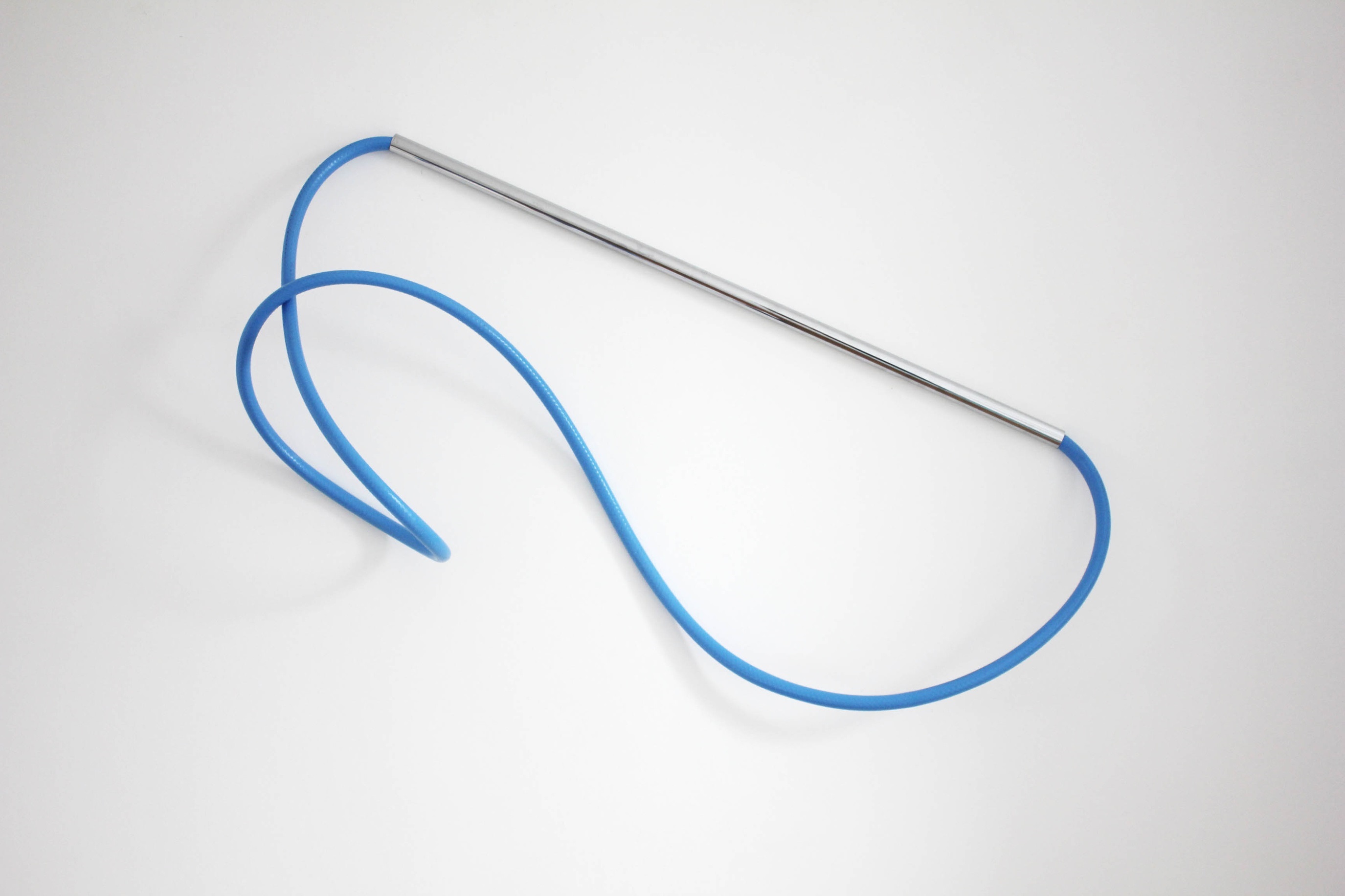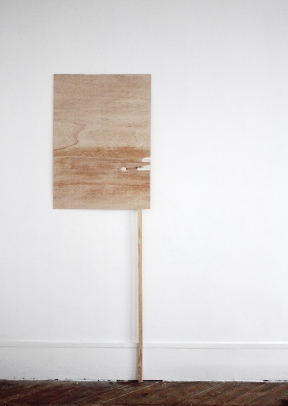 L’instabilité est à son paroxysme dans Pandue, 2019, en bois et papier, dont le titre est déjà une source d’inconfort et de perplexité. S’il s’agit d’une pendue, elle se présenterait à l’envers, le corps vers le haut et la corde montant depuis le sol… La stabilité de l’ensemble n’est assurée que par des boules de papier froissé glissées entre la paroi et une plaque de bois reposant sur un frêle tasseau vertical. Pour Léa Ducos, il s’agit ici de mettre en scène, de matérialiser et visualiser la notion de fragilité, en la poussant à son extrême, et, selon ses propres mots, d’adapter les équilibres au terrain choisi, d’inscrire le signe par une opération de glissement, de décalage.