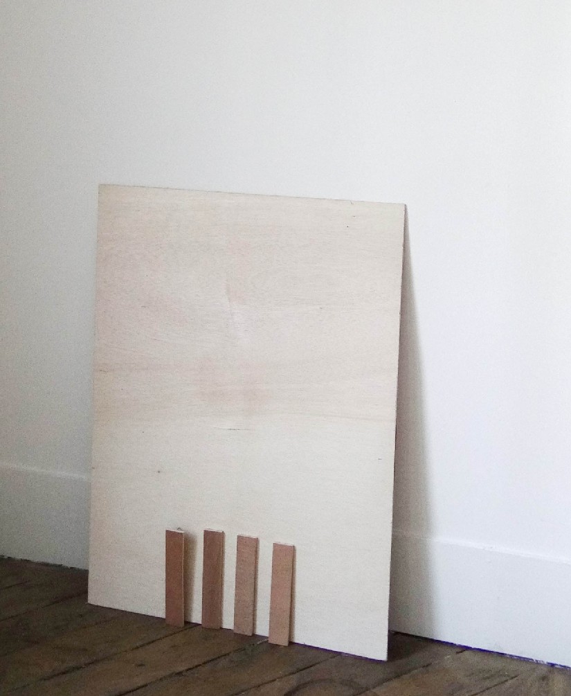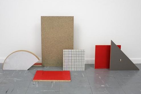 Metropolis, 2018, est une œuvre emblématique de la démarche de Léa Ducos. Six chutes de bois, quatre rectangulaires, une triangulaire et une en secteur circulaire, sont placées devant un mur, cinq verticalement, une au sol. Brute, laminée en gris ou blanc, rouges, ou blanc quadrillé de noir, elles se présentent d’abord pour ce qu’elles sont : des déchets rescapés d’un atelier de menuiserie. Ce n’est qu’en seconde lecture que, au-delà de l’évidente économie des moyens, le sens émerge. Il s’agit bien de la skyline d’une cité improbable, réduite à une échelle de quelques dizaines de centimètres. On se retrouve ici dans la situation du lecteur découvrant un sonnet de Mallarmé qui saisit les mots mais ne perçoit le sens que quand il en a fini la lecture et que la collision incandescente de quelques mots fait jaillir les images et le sens initialement cachés.