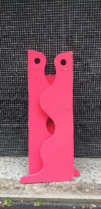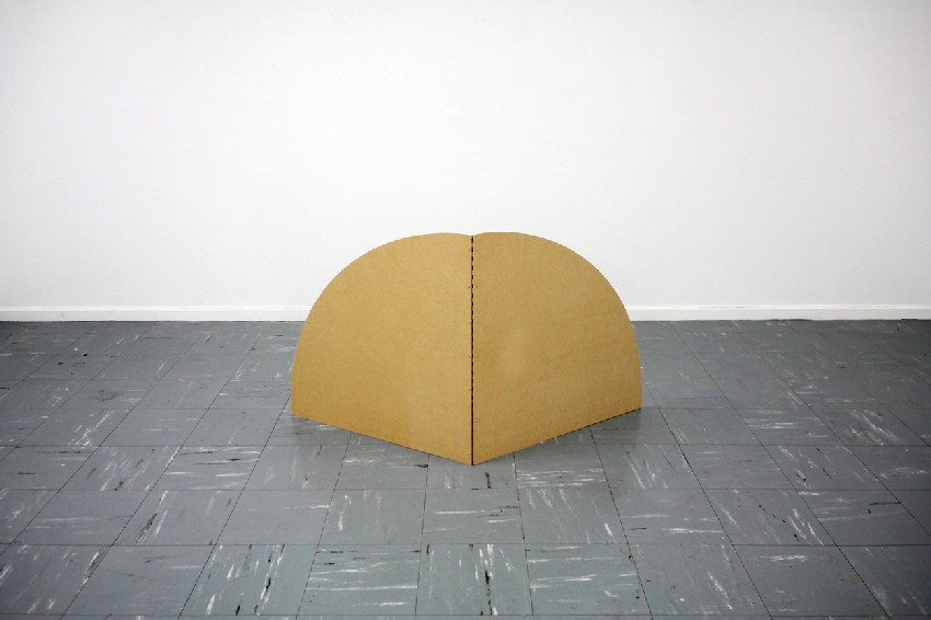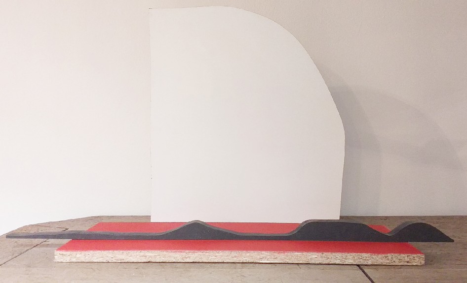 Vela latina, 2019, est encore plus simple, presque réduite à un idéogramme : une chute de laminé blanc, arrondie vers le haut, placée verticalement adossée à un mur, figurant la voile, un rectangle de stratifié rouge, horizontal, devant, pour représenter l’eau, et une contre-forme noire sinueuse, résultant de la découpe de lettres de grandes dimensions, posée dessus pour suggérer les vagues. Si l’on fait pivoter de 90° vers la gauche l’idéogramme chinois 帆 – fān – signifiant voguer, on obtient une approximation graphique de l’œuvre de Léa Ducos.