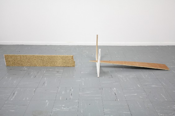 Certaines compositions ne manquent pas d’humour, comme Pianissimo, 2019, où quelques petites lattes de bois adossées à grand panneau blanc évoquent le clavier d’un piano, ou Sans-sens, 2018, avec deux quarts de cercles en bois brut, posés verticalement à angle droit, évoquant le caractère absurde de certaines situations. Avec Tremplin et Space (Oddity), toutes deux de 2018, les pièces s’affranchissent du mur et se présentent comme de très vulnérables pièges… Du moins sont-elles perçues comme telles par le visiteur invité à déambuler précautionneusement autour d’elles, risquant de les voir s’effondrer à tout moment. Il n’en est rien cependant. En effet, le déséquilibre n’est qu’apparent… car ces œuvres sont assemblées de telle façon que leur stabilité et leur pérennité sont bien assurées. L’artiste arrive ainsi, en recourant à des moyens d’une extrême simplicité, à déstabiliser le spectateur, presque à le culpabiliser…