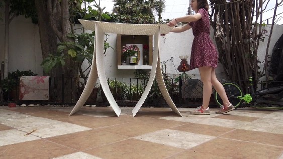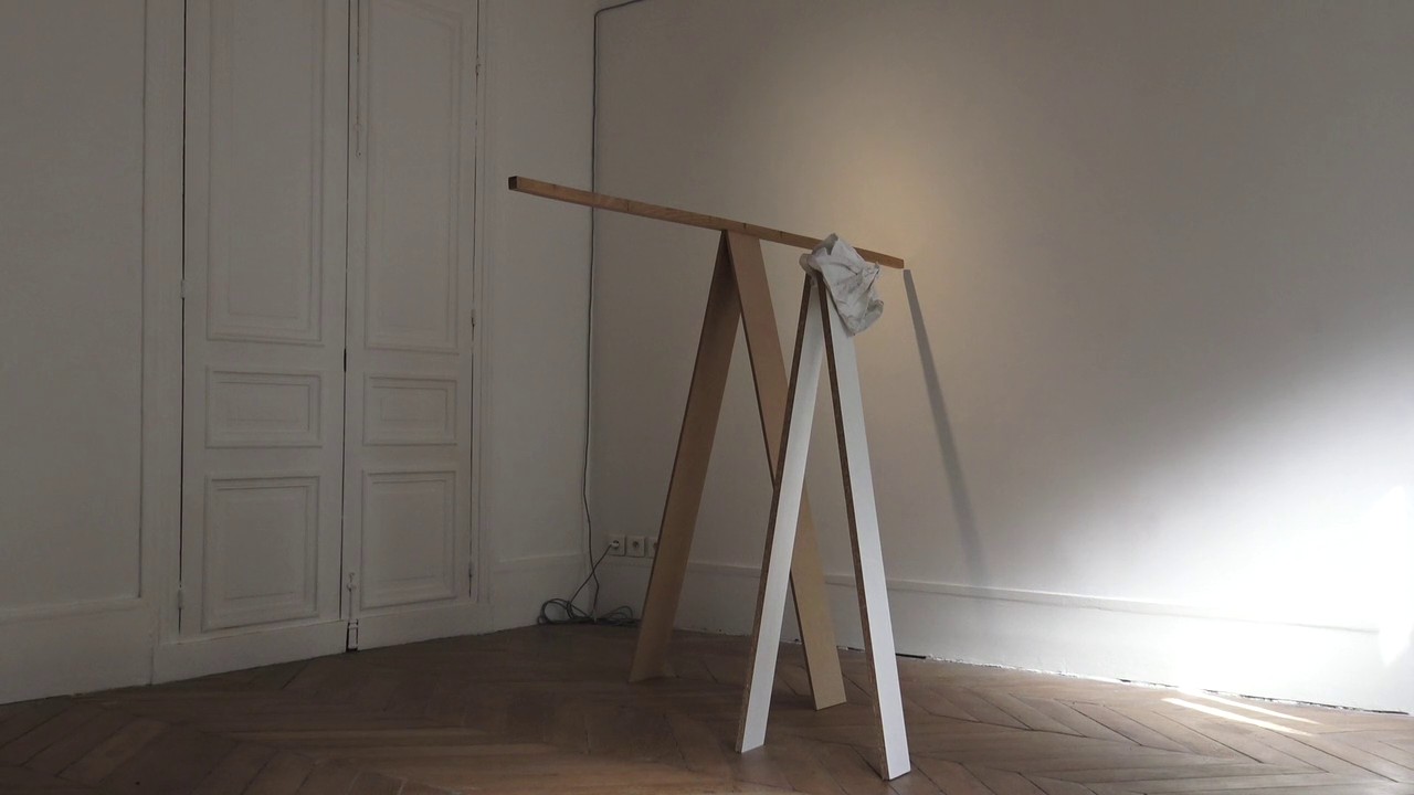 C’est dans ses brèves vidéo-actions que Léa Ducos exprime le mieux les notions d’instabilité et de précarité. Dans Deux temps, 2019, tournée dans son atelier, dans un premier temps en tenue de ville, elle construit un fragile assemblage de planches et de tasseaux, puis, dans un second temps, en combinaison blanche de laborantine, elle provoque la chute de l’ensemble. Dans Jardin souple, 2019, l’expérimentation se déroule dans un patio carrelé. Sur deux tréteaux de fortune, elle place en équilibre un panneau horizontal, puis fait vaciller la structure résultante jusqu’à ce qu’elle s’abatte. Dans Trois fois, 2019, dans la rue, sous l’œil indifférent des passants, elle tente, par trois fois, de construire un échafaudage de longues planches blanches. Quand elle réussit enfin à faire tenir ce précaire château de cartes, elle en provoque l’effondrement d’une simple pichenette.
