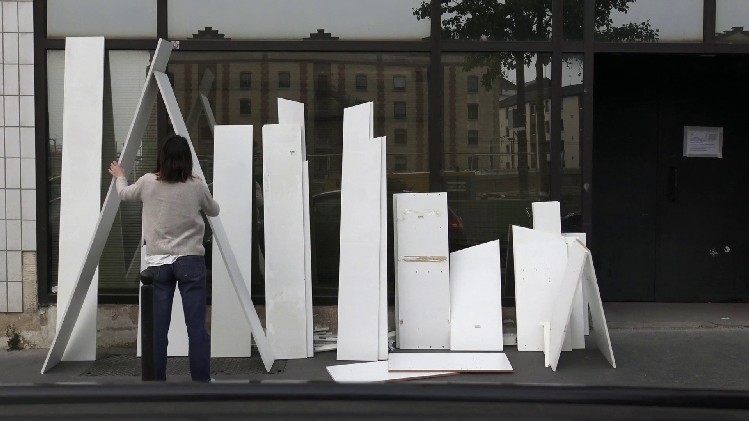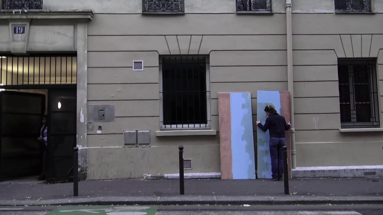 La vidéo Panorama, 2019, abandonnant provisoirement la thématique de l’instabilité, met en avant l’indécision et la gratuité apparentes d’un exercice consistant à permuter des planches de récupération, partiellement peintes en bleu, devant la façade d’un immeuble, dans un quartier populaire de Paris. Le tout sans altérer le va-et-vient des passants qui vaquent à leurs activités quotidiennes sans s’intéresser à ce qui se passe. Belle métaphore de la solitude de l’artiste, incompris du plus grand nombre de ses contemporains malgré ses efforts pour se rapprocher d’eux…