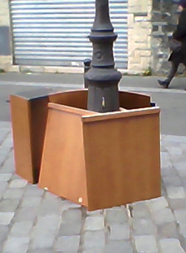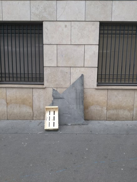 Dans Rue de Nantes, les structures verticales, roses devant un mur de mosaïques noires, prennent l’aspect d’une sculpture monumentale ou du totem d’un culte voué aux couleurs pop. Dans Rue du Surmelin, un lattis déglingué de traverses blanches masque partiellement un amas de panneaux découpés, blancs eux aussi. Dans Rue de l’Argonne, des planches en bois brut encadrent le pied d’un réverbère et semblent vouloir le protéger d’on ne sait trop quelle menace. À moins qu’il ne s’agisse de protéger le passant d’un danger imminent… Dans Quai de Valmy, une cagette de fruits, vide, s’appuie sur deux grands triangles gris d’un matériau que l’on peine à identifier.