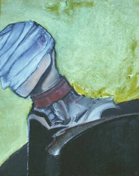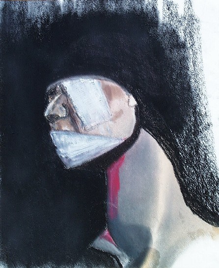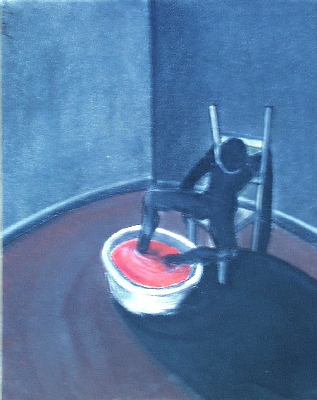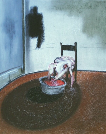 En 1997, Jérémy Laffon a donné, dans deux séries de dessins au pastel, Le dépeuplé et Image narrative, une traduction plastique de ce texte. La première série en offre une vision intériorisée, avec des visages masqués ou bandés qui font écho à notre triste actualité. La seconde se place du point de vue d’un observateur qui aurait pénétré le cylindre dont on aperçoit clairement la base. Un personnage, prostré sur une chaise y prend un bain de pieds dans une bassine remplie d’un liquide rouge qui ne peut être que du sang. Assis et non allongés, car, pour ces corps : « figés debout ou assis dans l’abandon sans retour. L’allongement est inconnu dans le cylindre et cette pose douceur des vaincus leur est ici refusée à jamais. »[9] Les images de Jérémy Laffon traduisent la double angoisse de l’enfermement et de la mort latente. On ne peut être plus d’actualité…