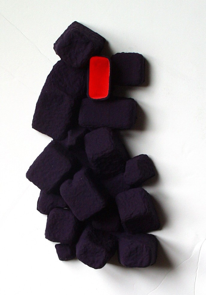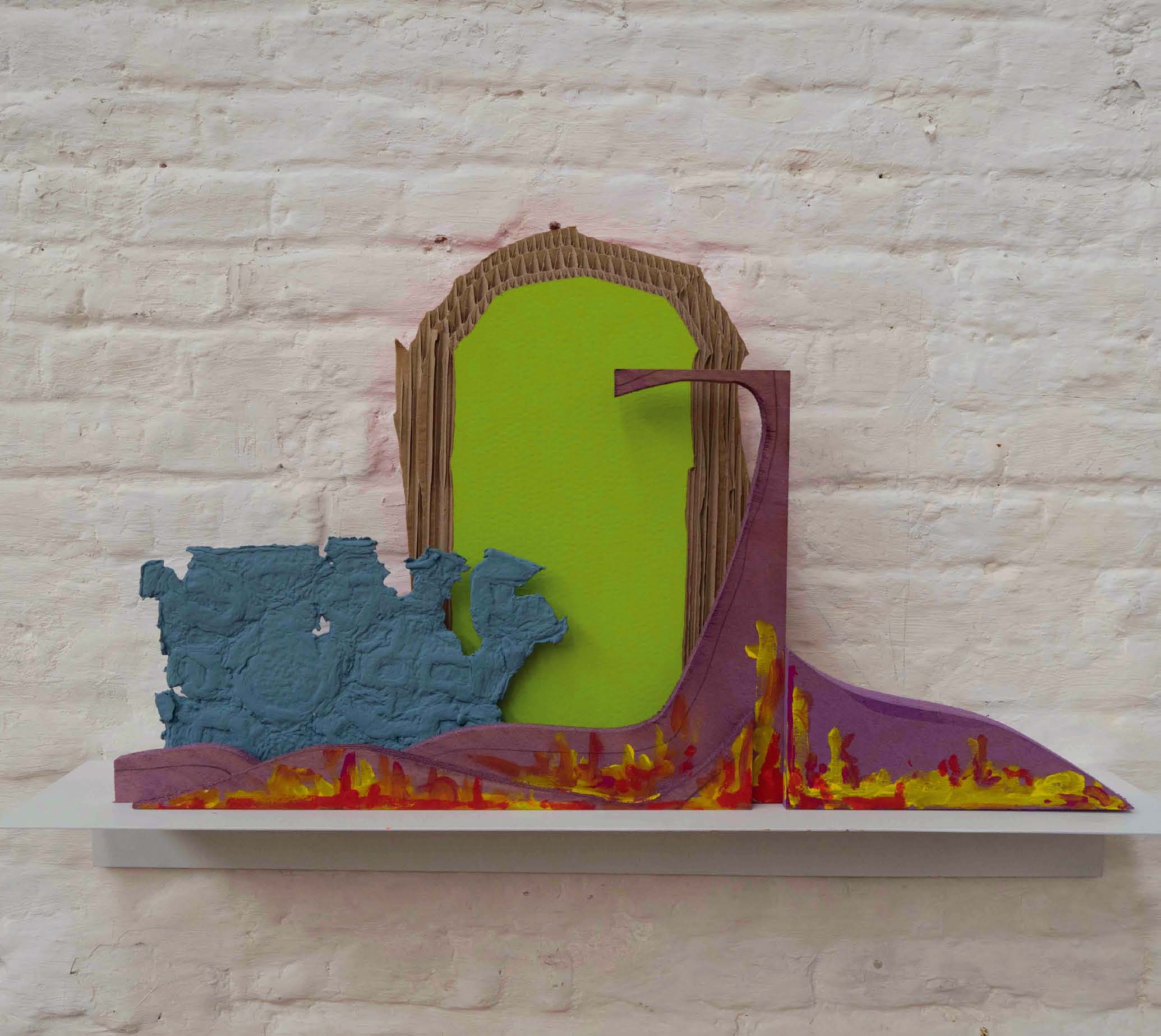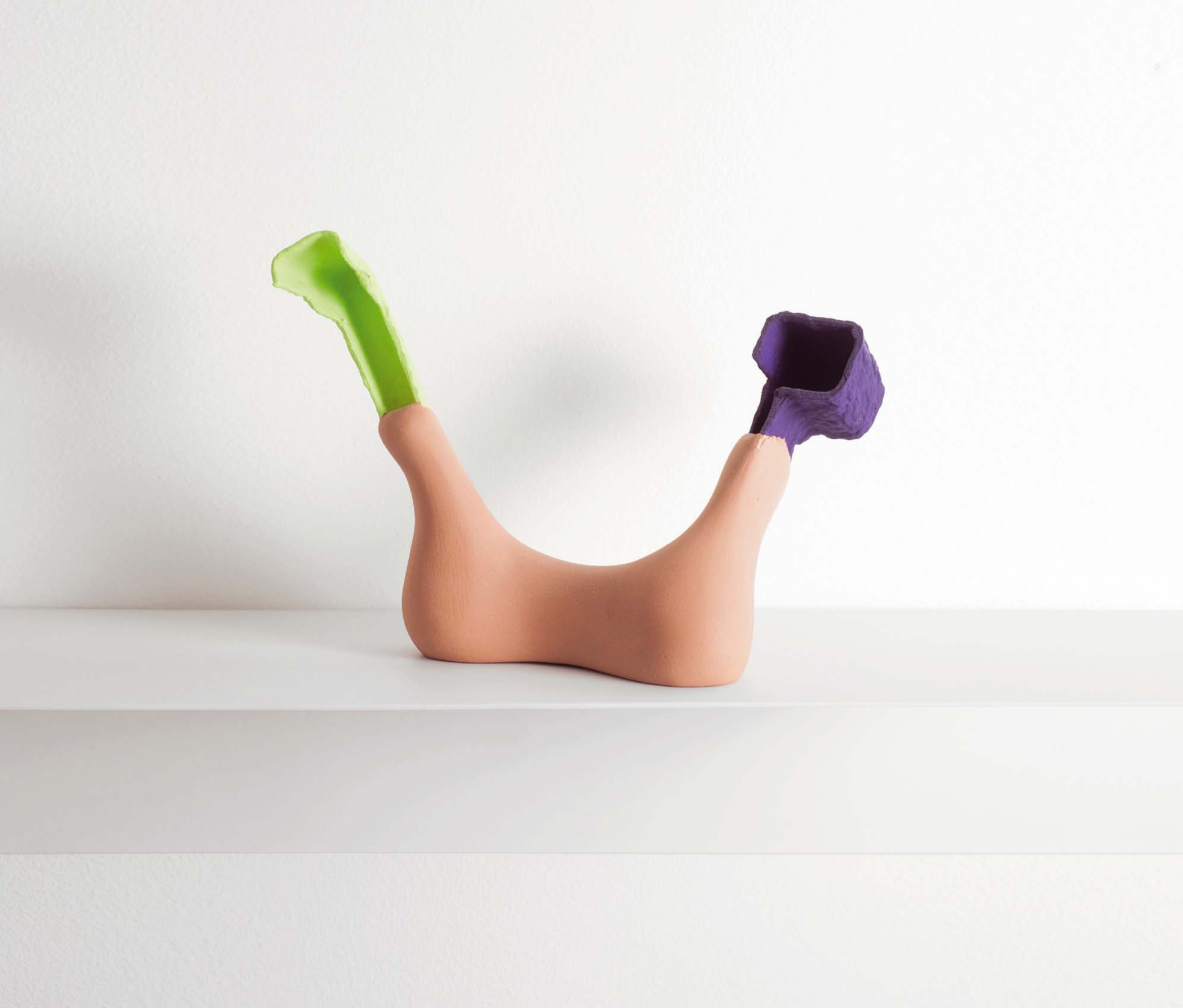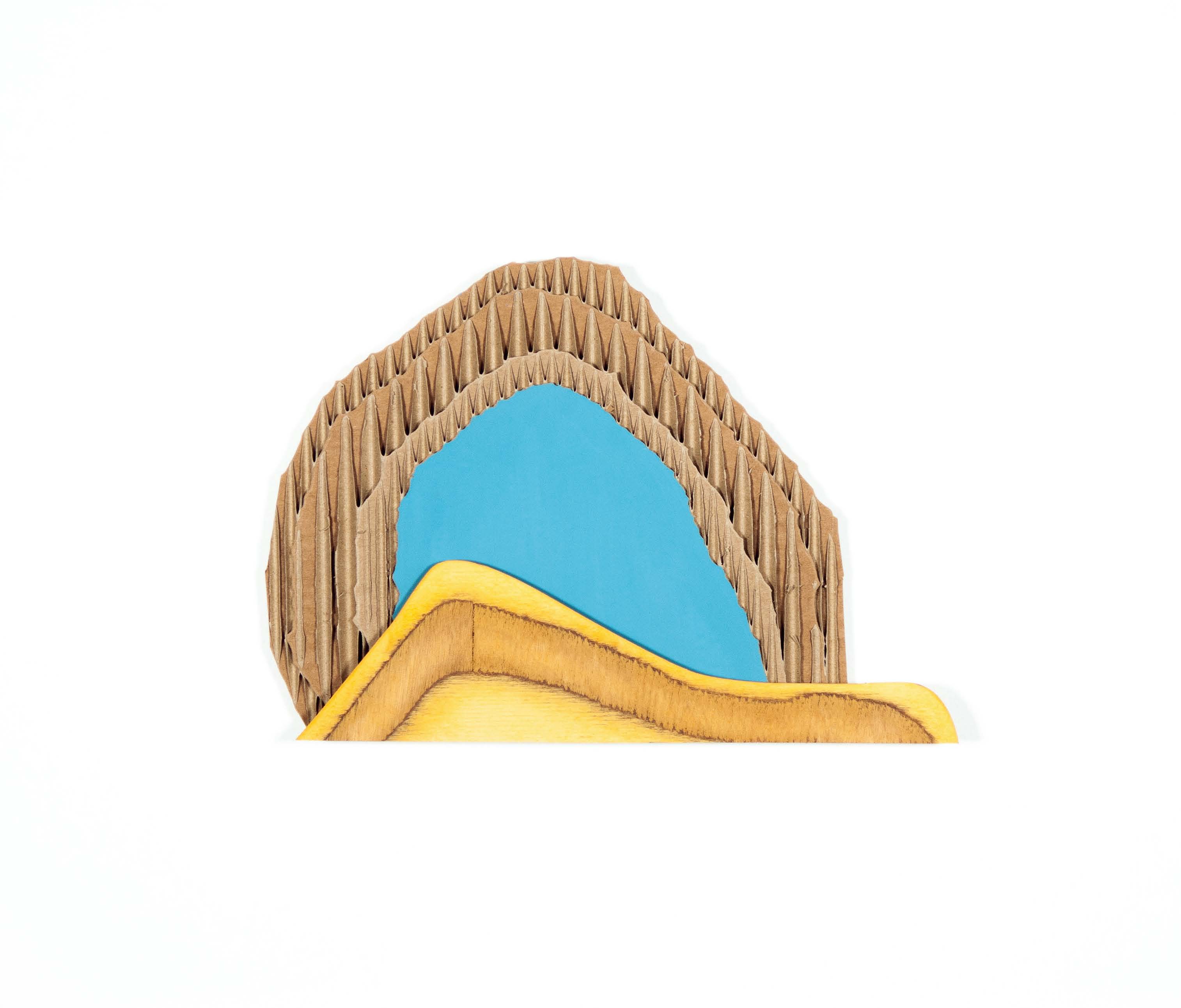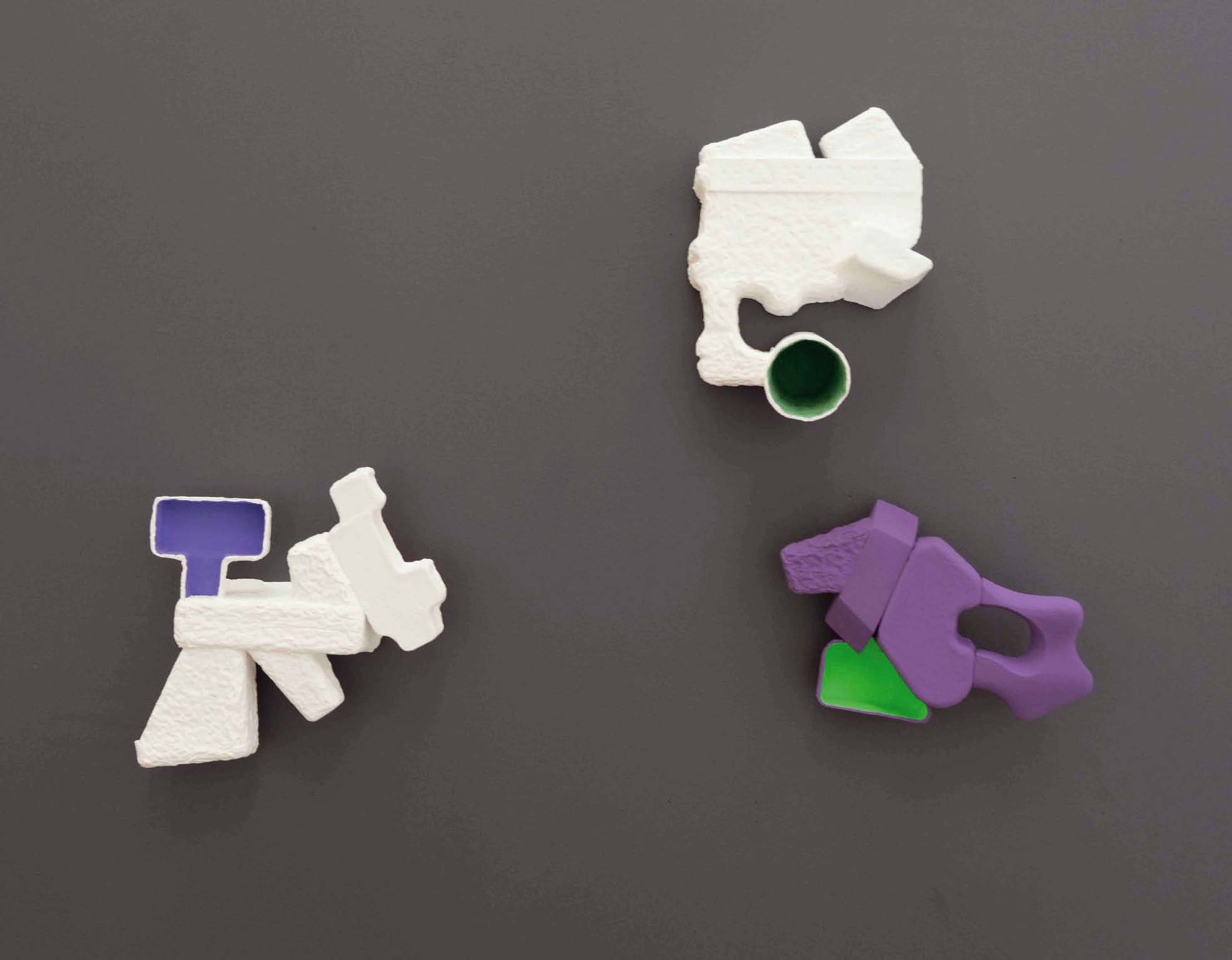 Pierre Corthay, bottier pour hommes de formation et de métier, utilise les emballages les plus divers comme matière première pour ses travaux : cartons, coques thermoformées, matières plastiques, cales… Il les déstructure, les restructure et les peint pour réaliser des volumes, de dimensions modestes, dont l’aspect évoque des matériaux plus nobles : bois, métal, porcelaine, céramique, terre cuite… Il les présente sur des étagères, comme les trophées d’un improbable cabinet de curiosités, ou accrochés au mur.