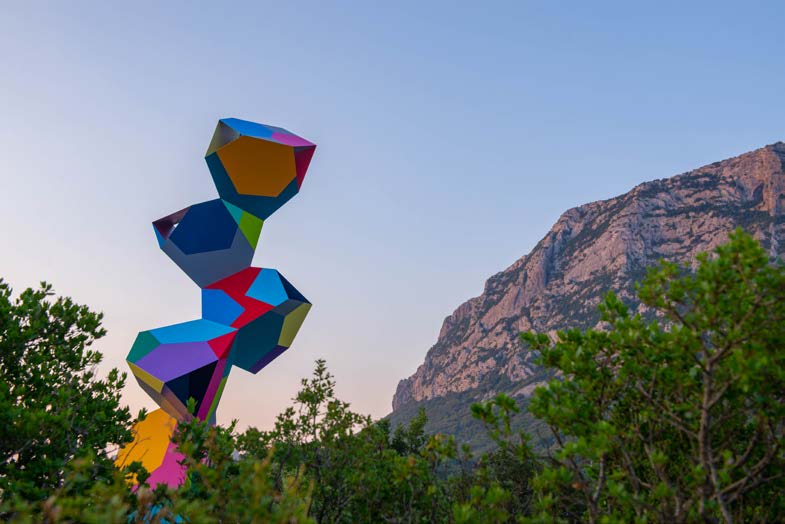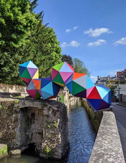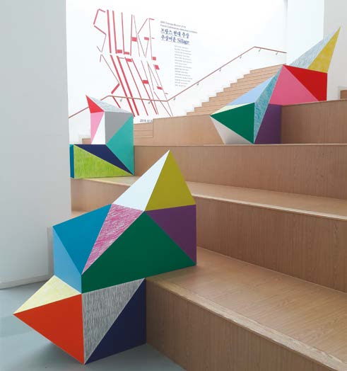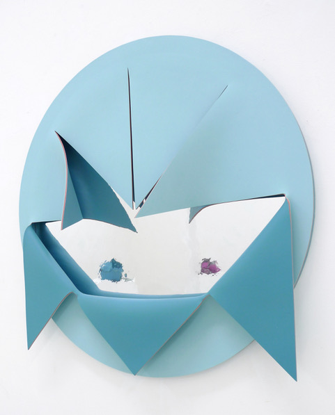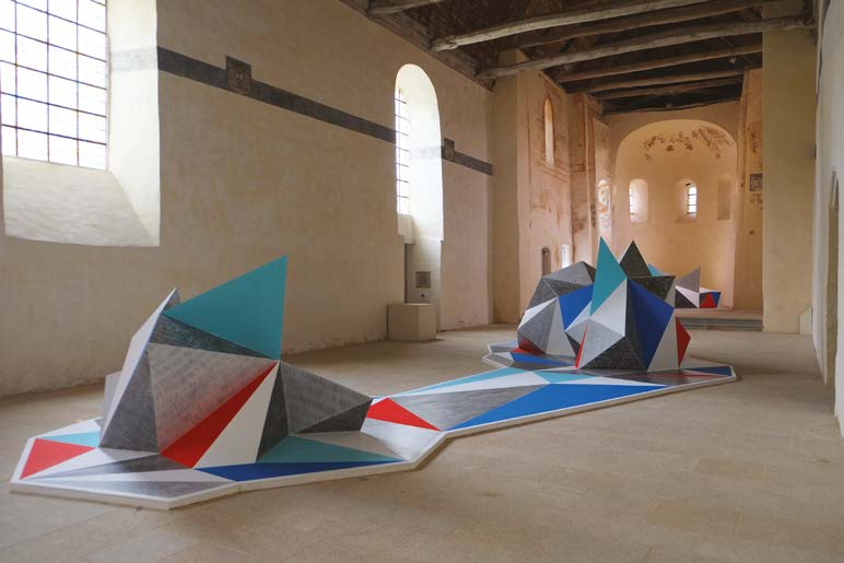 Élodie Boutry met en scène les relations entre peinture plane et espace tridimensionnel. Elle ne travaille que sous contrainte, que ces contraintes soient imposées par la structure des lieux qu’elle investit ou qu’elle se les fixe elle-même à travers des jeux de couleurs ou des rythmes prédéfinis. Sa facture est neutre, volontairement impersonnelle, pour écarter toute velléité de pathos, pour maintenir une distance avec le spectateur et sa subjectivité. Elle insiste pour que la lecture de ses travaux soit directe, sans affects ni effets superflus. Son objectif est la déstabilisation visuelle du regardeur qui s’interroge sur la véritable nature de ce qui lui est donné à voir. Ses volumes se développent à partir de surfaces planes, assemblées dans des structures de formes cristallines, des polyèdres plus ou moins réguliers, dont chacune des facettes se comporte comme un tableau autonome. Les travaux d’Élodie Boutry suscitent une multitude d’interrogations chez le spectateur. Où commence et s’arrête la surface picturale ? Quand le volume se fait-il surface ? Quand la surface devient-elle volume ? Comment la peinture devient-elle architecture et l’architecture peinture ? D’ailleurs, certaines de ses œuvres en volume, une fois démembrées, sont réassemblées pour donner naissance à ses Fragments – Upcycling, des tableaux en forme de puzzles… Du plan au volume, pour revenir au plan…