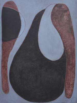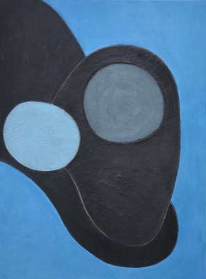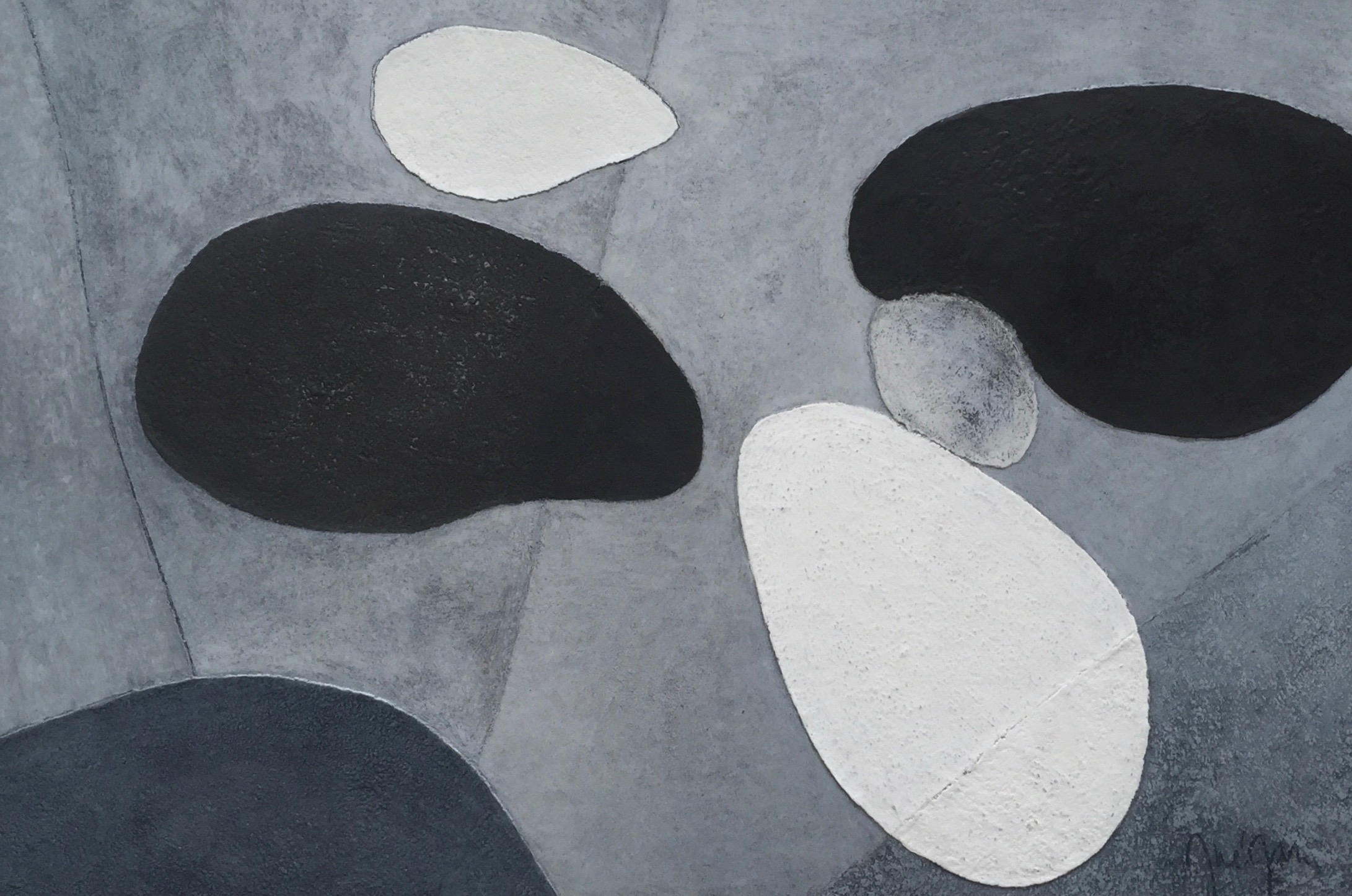 Marielle Guégan a des origines bretonnes. Les mégalithes armoricains hantent donc son imaginaire et ses œuvres, même si elle les désigne comme des monolithes et le spectateur pourrait y voir des aérolithes. De fait, l’artiste joue sur cette ambiguïté perceptive. L’environnement dans lequel ces formes se déploient demeure indéfini : air, terre, eau ? Peu importe. Ce qui importe pour elle, ce sont les interactions entre les masses colorées qui cherchent un fragile équilibre, inexorablement instable, lequel déjoue les lois newtoniennes de la gravitation. L’espace est résolument plan, mais l’agencement des formes et leur équilibre semble dicté par des forces – celles d’un deus ex machina – dont la source se situe hors-champ. Elles leur imposent des oscillations, des contractions, des fusions et des séparations… Un peu à la façon dont les corps célestes sont régis par des lois immuables qui nous échappent encore. Cette absence de notion d’échelle dans ce qui est donné à voir contribue à désorienter le spectateur, à le faire hésiter entre microcosme et macrocosme, entre bouillon de culture et nébuleuses, entre vide intersidéral, terre et eau…