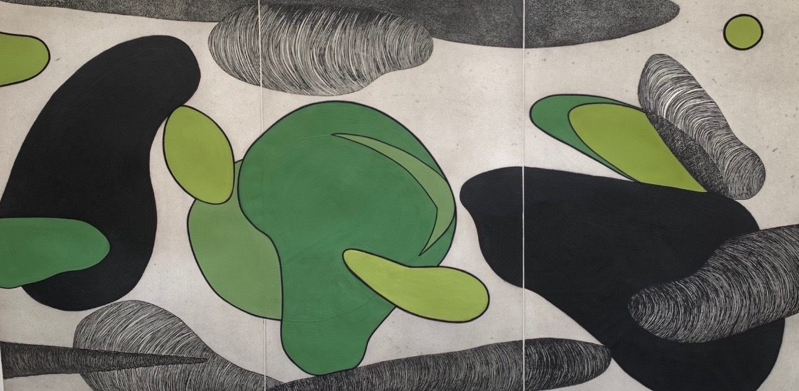 Chez Élodie Boutry, les interventions in situ sur les murs s’apparentent parfois à la pose d’un papier peint, peau éphémère sur des étendues qui seraient inintéressantes autrement. Dans ses dessins, les accidents superficiels renvoient à des processus biologiques cutanés : ocelles sur le pelage de félins, zébrures, défaut ou excès de mélamine, cellules carcinomateuses… À la libre interprétation du spectateur…