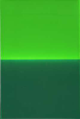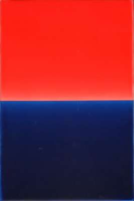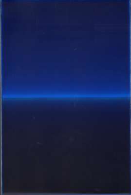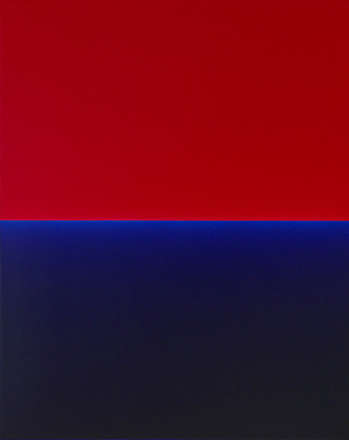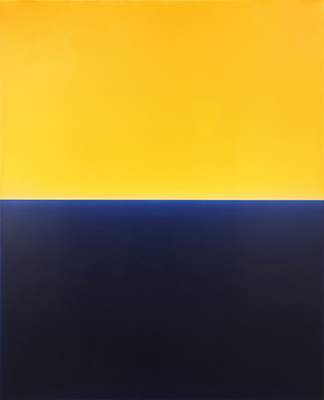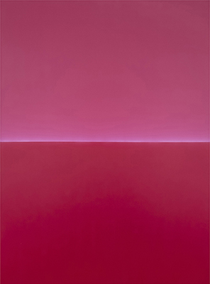 Les Horizons d’Élissa Marchal sont en deux dimensions. Dans cette série de toiles, deux rectangles de couleurs différentes – contrastées ou voisines – et de dimensions égales sont étagés verticalement sur une toile. Le fini est impeccable, lisse, presque réfléchissant… Dans chaque rectangle, l’intensité lumineuse de la couleur décroît quand elle s’approche de ses bords extérieurs et horizontaux. Un halo lumineux se crée alors à la jonction entre les deux plages, générant, malgré le minimalisme de la démarche de l’artiste, une profondeur quasiment illusionniste. La ligne de séparation des deux surfaces colorées se comporte alors comme la ligne d’horizon d’un improbable paysage. Une ligne apparemment en creux d’où sourd une aura lumineuse, surgissant d’un vide d’où la peinture s’est retirée. Cette ligne-lumière et son halo sont plus ou moins visibles selon la luminosité environnante. Elle impose un effort perceptif de la part du spectateur. Elle est cet horizon qui « souligne l’infini », comme se plaisait à le dire Victor Hugo.[4] Les lois de la physique traditionnelle voudraient que les deux masses colorées juxtaposées s’attirent, mais la lumière, suintant du mince sillon lumineux qui les sépare, provoque l’effet contraire. Il repousse les deux formes et évoque la profondeur. L’équilibre de l’ensemble résulte ainsi de la conjonction de ces deux forces antagonistes : attraction et répulsion. Plus qu’une métaphore de l’écriture, cette ligne de séparation est donc une frontière, dans le plein sens de ce terme : un entre-deux, un inframince[5] qui peut unir ou diviser, selon les circonstances, selon ce que l’on veut en faire… En notre époque où il est si souvent question de frontières, de leur ouverture ou de leur fermeture, le message d’Élissa Marchal ne manque pas de pertinence…