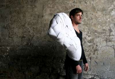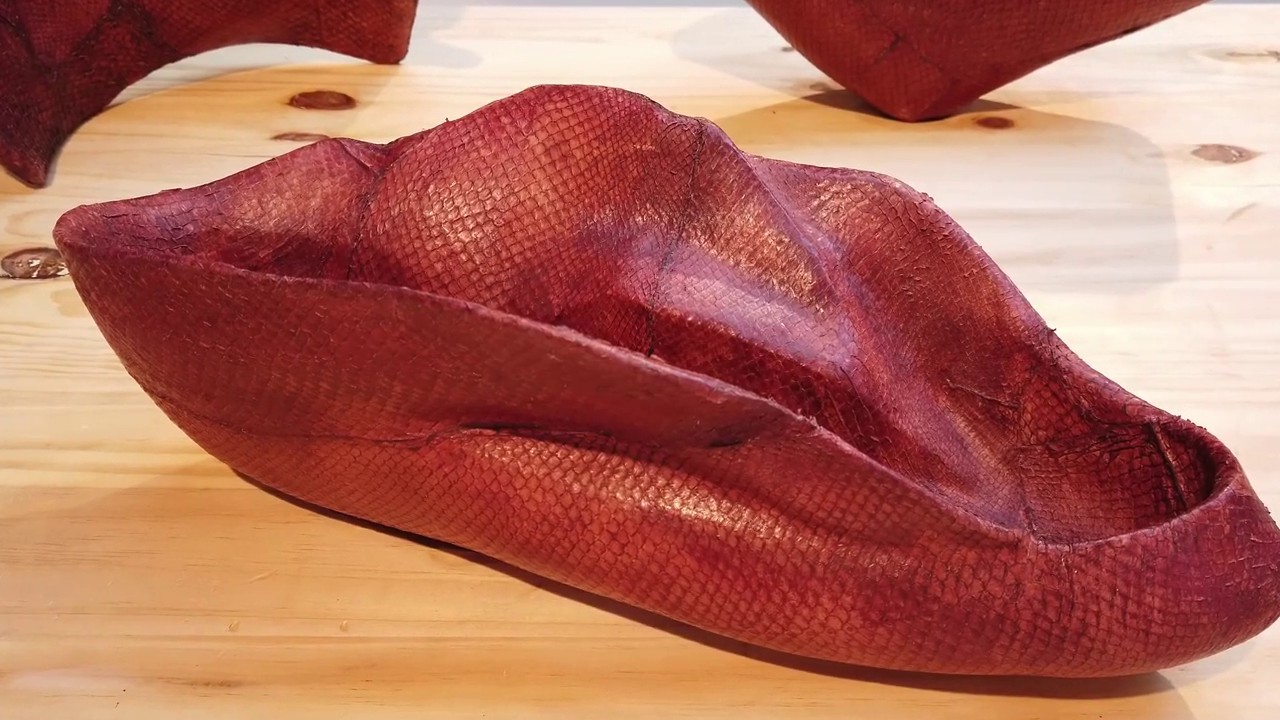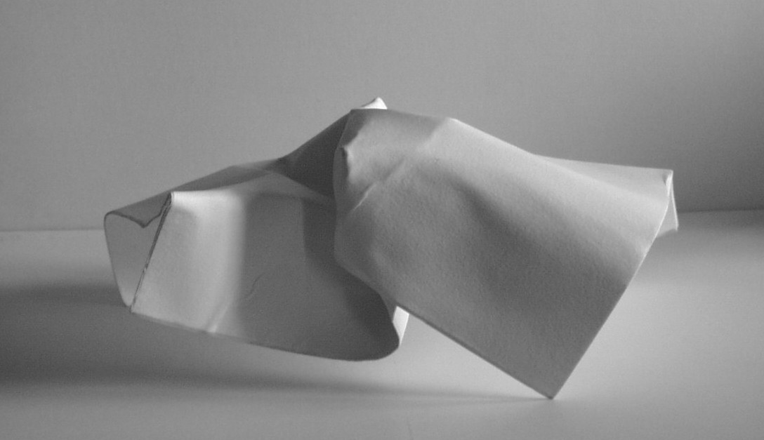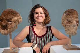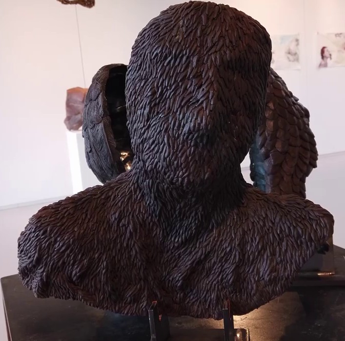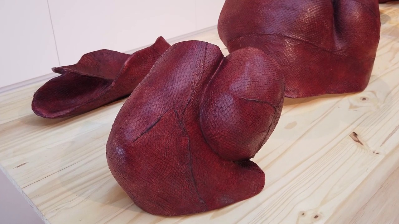 Sous le titre Je m’étais changée en saumon affairé à remonter ton silence, 2020, Claire Barbier nous livre une autre réflexion sur l’épiderme, sur son intérieur et son extérieur. Il s’agit, ici, de peaux de saumons tannées, moulées sur des fragments de corps – le sien ou celui de ses proches –, puis assemblés sans que l’on puisse discerner l’origine des formes. Il y est question de corps éclatés, de morcellement, mais sans que cela évoque la moindre douleur ni trace de violence. On peut y lire des références à des mues de serpent, à des carapaces protectrices, à des boucliers, à des cimiers ou à des masques issus de civilisations extra-européennes… Toutes choses qui matérialisent la limite entre un intérieur et un extérieur, sans que l’on sache toujours déterminer ce qui est dehors et ce qui est dedans… Claire Barbier écrit : « Mes sculptures s’élaborent presque tout le temps sur les moulages de parties du corps. De mon corps ou de corps aimés. La sculpture en prend l’empreinte, et s’érige comme extension du corps dans une excentricité, une idiosyncrasie propre. Le moulage disparaît une fois la pièce finie. Il n’en reste que son empreinte. Corps sentinelle – corps monolithe – corps debout. Mètre-étalon. Il va vers la bête, en demeurant référent. La matière rencontre le bestial. Elle devient voix des métamorphoses en territoire liminaire. »[12] Cette préoccupation est ancienne, chez elle, car, dès 2011, dans sa série Petit papier, elle nous proposait des formes ambiguës, de même nature, en carton froissé qui mimait la fragilité de la porcelaine.
