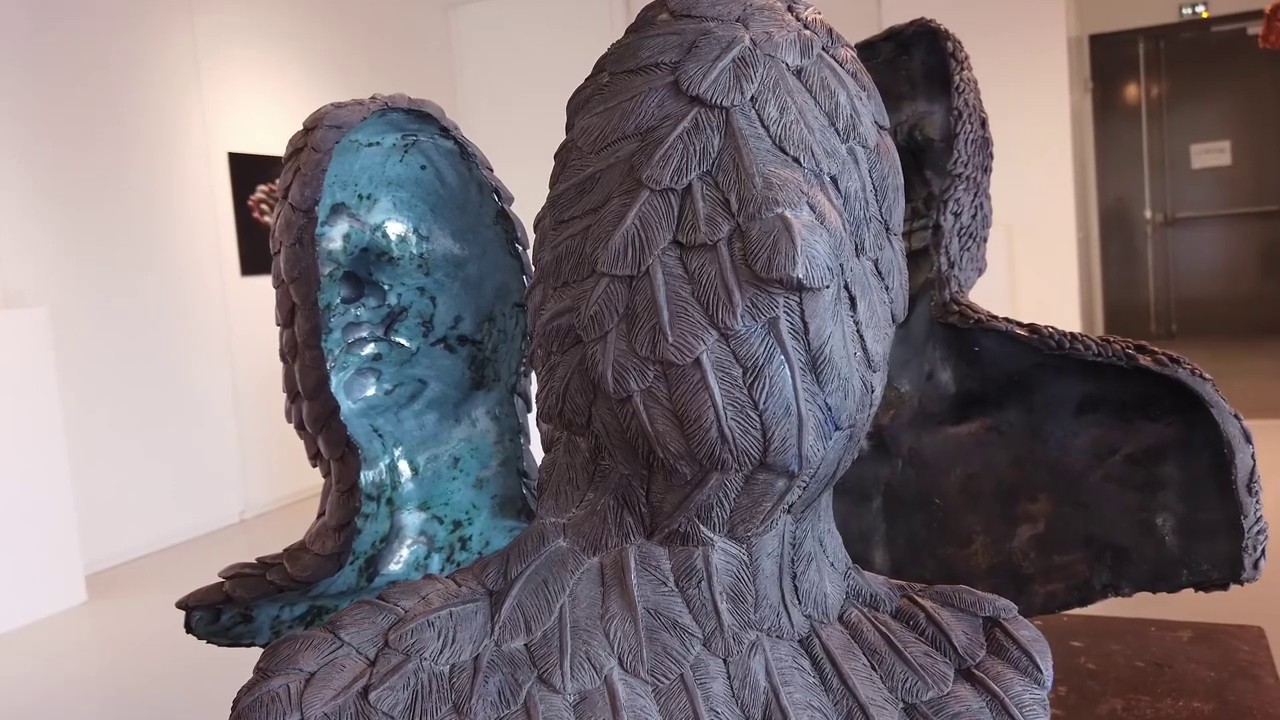 Derrière le visage, 2018, est un ensemble de trois estampages modelés en céramique dont seul l’intérieur est émaillé. On y distingue clairement les traits du modèle. En revanche, l’extérieur, non émaillé, figure des écailles de pangolin, des plumes d’oiseau ou des poils d’une louve-ourse. L’artiste pose ici la question de l’indifférenciation et de la réversibilité des statuts humain et animal… Tout dépend du point de vue, au sens premier de cette expression… Nous sommes aux antipodes des figurations des Janus romains qui ne montraient que l’aspect extérieur d’un personnage, fût-il double, sans révéler quoi que ce soit de son intériorité. Je ne peux aussi m’empêcher de penser à la façon dont Agamben aborde la question du loup-garou : « La loi salique et la lex ripuaria utilisent la formule wargus sit, hoc est expulsus dans un sens qui rappelle le sacer est sanctionnant la possible mise à mort de l’homme sacré. De même, les lois d’Édouard le Confesseur (1130-35) qualifient le bandit de wulfesheud, (littéralement tête de loup) et l’assimilent à un loup-garou. Ce qui devait demeurer dans l’inconscient collectif comme un monstre hybride, mi humain mi animal, partagé entre la forêt et la ville – le loup-garou – est donc à l’origine la figure de celui qui a été banni de la communauté. »[5] Nous sommes donc, ici, face à la réunion, sur la même table (qui pourrait être celle de dissection de Lautréamont[6]), d’un pangolin-garou, d’un oiseau-garou et d’une ourse-louve-garou. Agamben, dans le même ouvrage, développe longuement la notion d’homo sacer,[7] expression latine pour homme sacré, qui est un statut issu du droit romain décrit par Sextus Pompeius Festus.[8] Il s’agit d’une personne qui est exclue, qui peut être tuée par n’importe qui (qui occidit parricidi non damnatur), mais qui ne peut faire l’objet d’un sacrifice humain lors d’une cérémonie religieuse (neque fas est eum immolari). Cette personne ne dispose plus d’aucun droit civique et est vouée à l’errance, à l’exil ou à vivre recluse. Agamben développe ensuite des considérations sur le bannissement, sur le vitae necisque potestas, droit de vie et de mort, et sur le double corps du souverain. Il est question de tout ceci dans Derrière le visage : l’homme de l’intérieur bannissant celui de l’extérieur, lequel est livré à la vindicte populaire, le droit de vie et de mort du chasseur sur le chassé, du prédateur sur sa proie… Plus généralement, nous visualisons, dans cette œuvre, les oppositions dialectiques extérieur-intérieur, cité-maison, politique-économique,[9] règne-gouvernement, telles qu’Agamben les développe dans Il regno e la gloria. Per una genealogia teologica dell’economia e del governo, 2009. Si ce n’est que, chez Claire Barbier, l’œuvre est ouverte, réalisant une forme de synthèse entre deux propositions apparemment irréconciliables. Cette notion d’ouverture prend un rôle important dans beaucoup de ses œuvres, le champ de manifestation de cette synthèse étant, comme je l’ai déjà souligné, la surface même de l’œuvre, un épiderme, une écorce, un pelage, une peau, un cuir… Une épaisseur mentale, cognitive et psychique matérialisée par cet inframince, mot par lequel Marcel Duchamp désignait une différence ou un intervalle imperceptible, parfois seulement imaginable, entre deux phénomènes