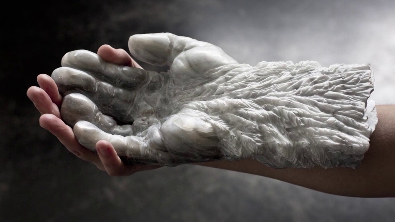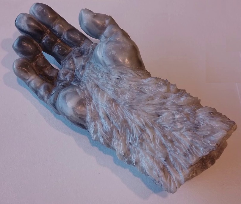 De chasse et de prédation il est question dans Actéon, 2014. Ces pièces, sculptées en pierre de talc, montrent les membres terminaux, mains et pieds, du chasseur Actéon en cours de métamorphose en cerf. Dans le mythe, rapporté par Ovide, le chasseur Actéon surprit involontairement Artémis-Diane au bain, nue avec ses nymphes. La déesse, pour venger ce sacrilège, transforma l’indiscret en cerf, lequel fut déchiqueté et mis à mort par ses propres chiens. Actéon est bien, dans cette légende, un homo sacer. En effet, ce n’est pas la déesse, figure de la Justice, qui exécute la condamnation, mais les chiens du chasseur, représentant les citoyens, le n’importe qui de Festus, rendus fous de rage par la victime du voyeur, au point de ne pas reconnaître leur maître. À bien y regarder, l’histoire est quelque peu plus complexe. Dans une première phase, c’est Actéon qui se comporte en prédateur, vis-à-vis des gibiers qu’il poursuit avec son arc et ses flèches, puis de la déesse et de sa cour, son arme étant alors les traits décochés par son propre regard concupiscent. Dans une seconde phase, après l’arrêt rendu, il devient lui-même proie, la prédatrice étant Artémis-Diane instrumentalisée par les chiens du chasseur, car le statut d’homo sacer d’Actéon condamné lui interdisait d’intervenir directement… Le prédateur prédaté, pourrait-on dire en recourant à ce néologisme… Demeure la question dont la réponse est laissée ouverte par Claire Barbier : quelle est la nocivité, la létalité potentielle, du regard d’Actéon et, plus généralement, de celui de tout homme de notre temps porté sur une femme, nue ou habillée ? Et, pour s’en prémunir, faut-il recourir à ces voiles qui défraient la chronique et dont les premières victimes sont les femmes, victimes innocentes de la libido masculine et injustement condamnées par elle, devenant ainsi des mulieres sacrae ? Claire Barbier a, depuis longtemps, investi et tenté de défricher ce monde des possibles qui peut prendre la forme de modernes métamorphoses ovidiennes, tel cet ange qui déambule, dans Manteau de papier, 2011, ou cette figure mi-cerf mi-homme, dans The Messenger, 2010, relectures, réactualisations ou recréations de modèles archétypaux, dans un rapport animiste aux choses qui renvoie au Temps du mythe développé par Claude Lévi-Strauss ou au Temps du rêve des aborigènes australiens.