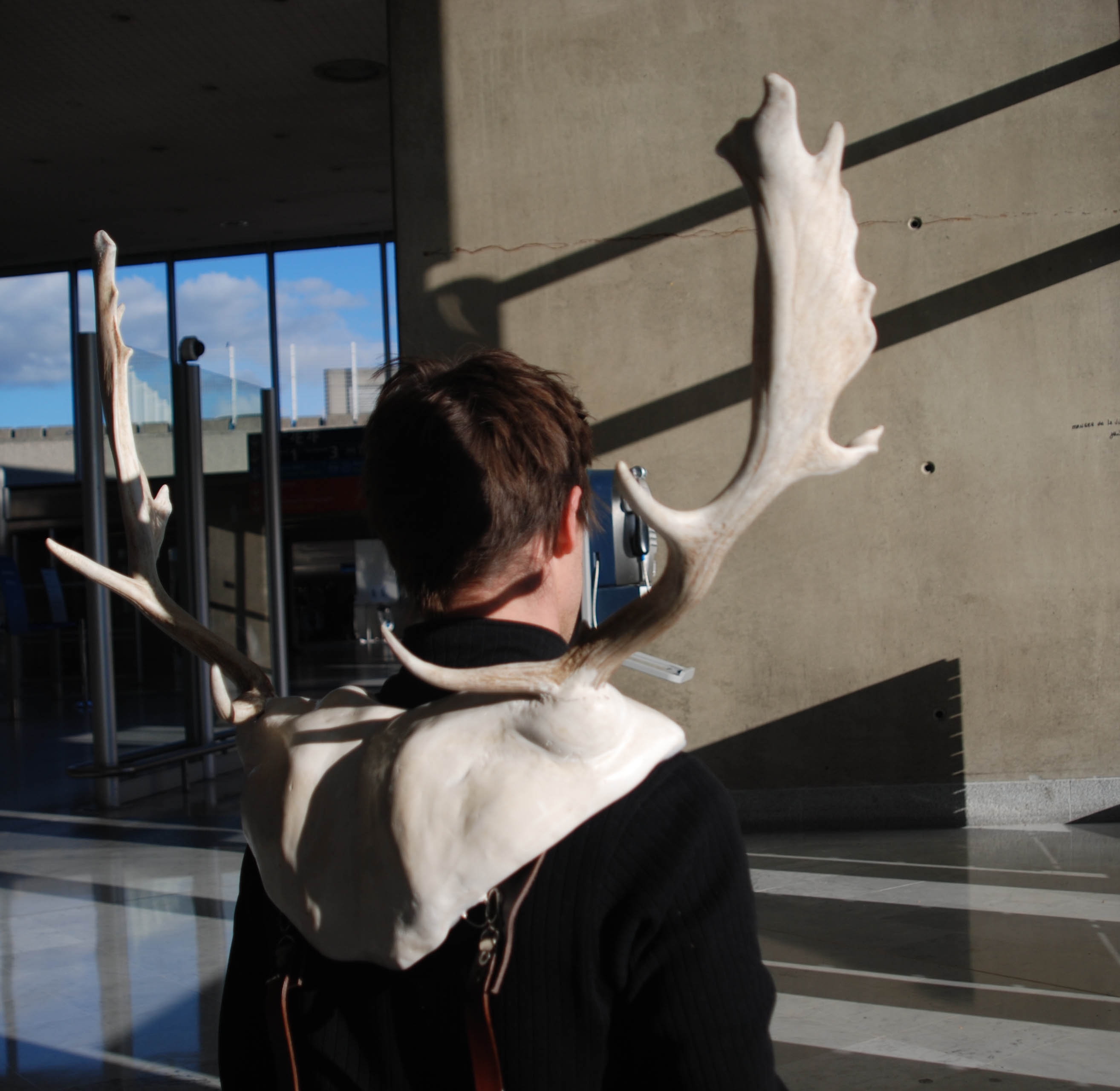 Sur le coup, je me suis dit que les travaux de Claire Barbier, explorant la limite et les interférences entre animalité et humanité, s’inscrivaient bien dans cette démarche analytique. En effet, selon ses propres mots, elle travaille sur l’animalité et l’ensauvagement. Ses œuvres prennent la forme de modernes relectures des métamorphoses ovidiennes ou de mythes qui hantent notre culture occidentale depuis des millénaires. C’est donc à une sorte d’intrusion, comme par effraction, dans l’inconscient collectif que Claire Barbier nous convie. Elle joue ainsi le rôle d’un très bachelardien sismographe des états d’âme mais aussi des fantasmes de notre société, sans cesse tiraillée entre humanité et animalité. On y trouve aussi cette tension entre identité et altérité, matérialisée par la peau, le cuir, le pelage ou l’écorce, ces frontières, physiquement inframinces mais affectivement lourdes de sens, entre intérieur et extérieur… Autre faisceau de forces opposées qui s’ajoutent à celles évoquées dans la citation en exergue de ce texte. Claire Barbier revendique pleinement ce rôle, par exemple quand elle déclare : « Mon travail interroge la perméabilité, celle qui brouille toute raison empirique, celle où l’humain rencontre la bête, où la pierre devient organisme, où le chant devient rocher, où les genres se questionnent. Cette frontière floue où les caractères, les archétypes et artifices qui détachent le sauvage du civilisé deviennent sans pertinences. Je veux rêver un corps dont le derme deviendrait feuille, un granit qui à force de dialoguer avec le ruisseau prendrait vie, un tapis de mousse qui garderait amoureusement l’empreinte des pas de celui qui l’arpente. Je veux penser un regard qui deviendrait pisteur, élevé à la lecture des invisibles, à lever les signes du passage de créatures. La sculpture devient trace, et le regardeur chasseur. »[3]