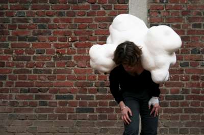 La préoccupation, partagée avec Agamben, d’un dehors confronté à un dedans n’est pas nouvelle chez Claire Barbier. Elle avait placé sa première exposition, à la Galerie du Haut-Pavé, en 2011, sous le signe de la forêt. Au sens étymologique, la forêt est un foris, un en dehors où tout peut devenir possible. Chez les psychanalystes, la forêt représente la femme et son mystère, la mère primitive, dans sa dimension sauvage et instinctive. Elle symbolise l’harmonie de la plénitude de la féminité, mais peut abriter des ombres inquiétantes, des animaux sauvages ou des voleurs de grand chemin, signes d’un instinct difficilement refoulé, attaché à la satisfaction des seules fonctions vitales. C’est aussi le décor naturel le plus utilisé pour les contes d’enfants, un lieu magique où tout devient possible. La forêt de Claire Barbier est un peu tout ceci à la fois, mais aussi ce que Bachelard en fait, un état d’âme[10]. Elle tente de saisir l’insaisissable : le souffle, le vent, les nuages fugaces, le silence d’un ange qui passe, le rêve éphémère, l’empreinte du temps qui file, celles des hommes ou des animaux mortels… Elle cultive le paradoxe dans le choix de ses matériaux. Aussi variés soient-ils, ils deviennent réceptacles, empreintes, traductions d’une fugacité mouvante et impalpable… l’antithèse de ce qu’est la sculpture. Prenant, par exemple, au pied de la lettre l’expression figurée nuages lourds, elle en a fait des modèles en céramique dont elle souligne le poids en les mettant en scène dans des poses qui accentuent leur pesanteur, dans la série des céramiques Prêt à porter, 2010, leur caractère enrobant, dans les papiers découpés et collés d’English Cloud, 2010, leur fragile matérialité. On y peut aussi voir une traduction plastique de ce que la psychanalyse associe aux nuages : obscurcissements passagers de la conscience, interférences entre l’extérieur et l’intérieur, brouillages des impressions par le doute.