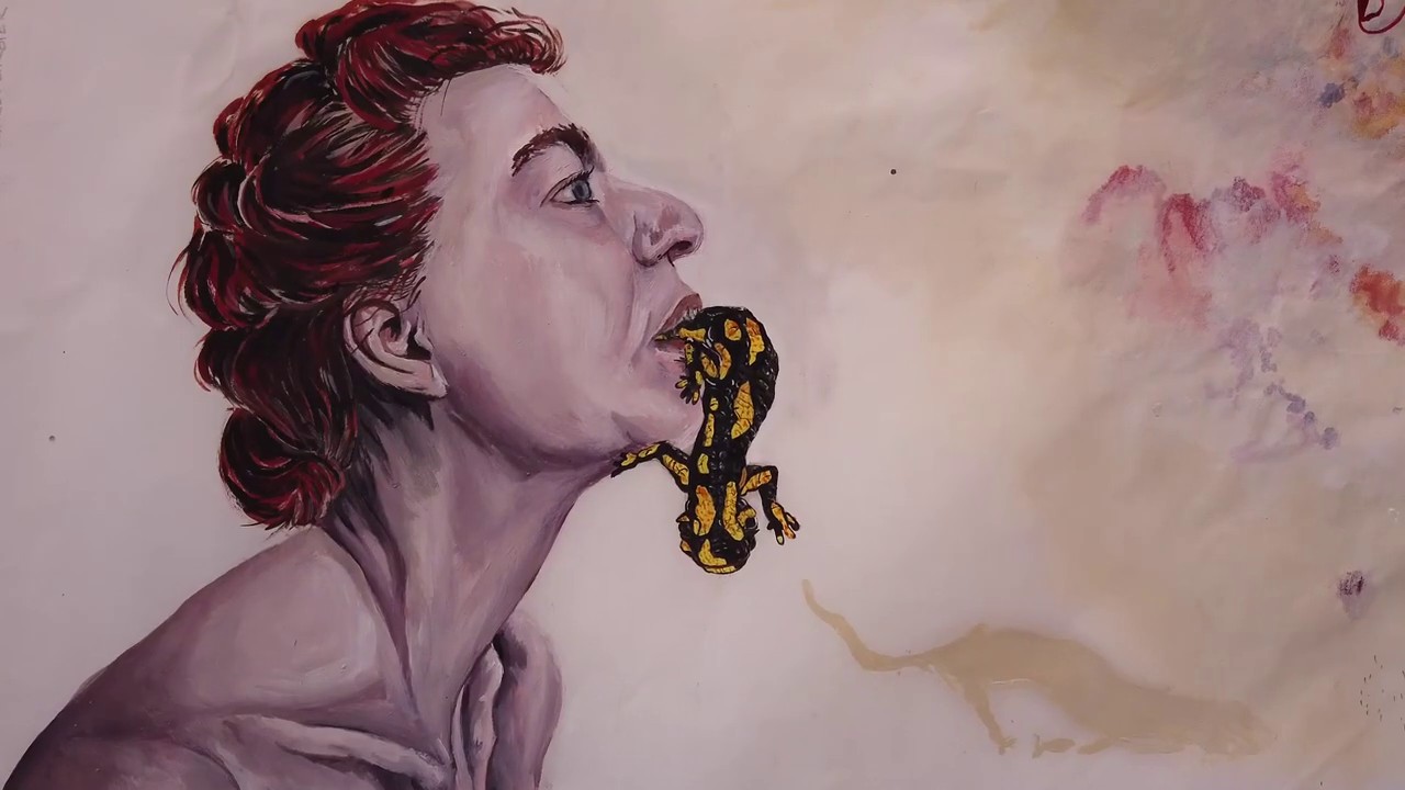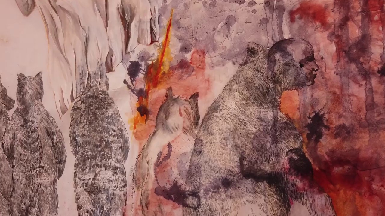 Les confinements successifs de l’année 2020, condamnant l’artiste à un intérieur quelque peu privatif de libertés, l’ont poussée à développer une pratique jusqu’alors peu présente chez elle, essentiellement adonnée à la sculpture : le dessin. Elle nous a livré une série de feuilles, transcriptions de rêves nocturnes ou éveillés, empreints d’une forte dimension psychanalytique. Au fil des planches, on découvre des cohortes d’ours humanisés (ou d’humains ursisés), un cœur palpitant recueilli, tel une fleur ou une offrande, dans une main féminine, un lézard coloré sortant de la bouche d’une femme, des serpents grouillant sur une main… Autres formes d’hybridations dont l’artiste s’explique : « Mon travail depuis des années questionne l’humain dans sa présupposée opposition avec le sauvage. L’hybridité est le cœur de ma démarche, en cela qu’elle interroge et provoque la rencontre des genres. L’hybridité pourrait être le pont, qui ouvre les mondes les uns aux autres. Notre civilisation a placé l’homme au-dessus d’un système pyramidal et nous en payons aujourd’hui le lourd tribut. En réaction à cela, il semble s’opérer une sorte de syncrétisme, qui pousse les artistes vers la bête, vers un ensauvagement, que le temps du mythe rend visible. Ainsi, nous avons besoin d’enfiler la peau de l’ours, de nous sentir en fraternité avec ce que le loup nous dévoile. »[11] Ouverture… Toujours l’ouverture…