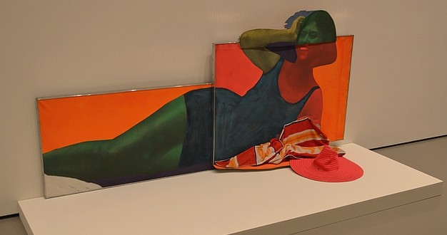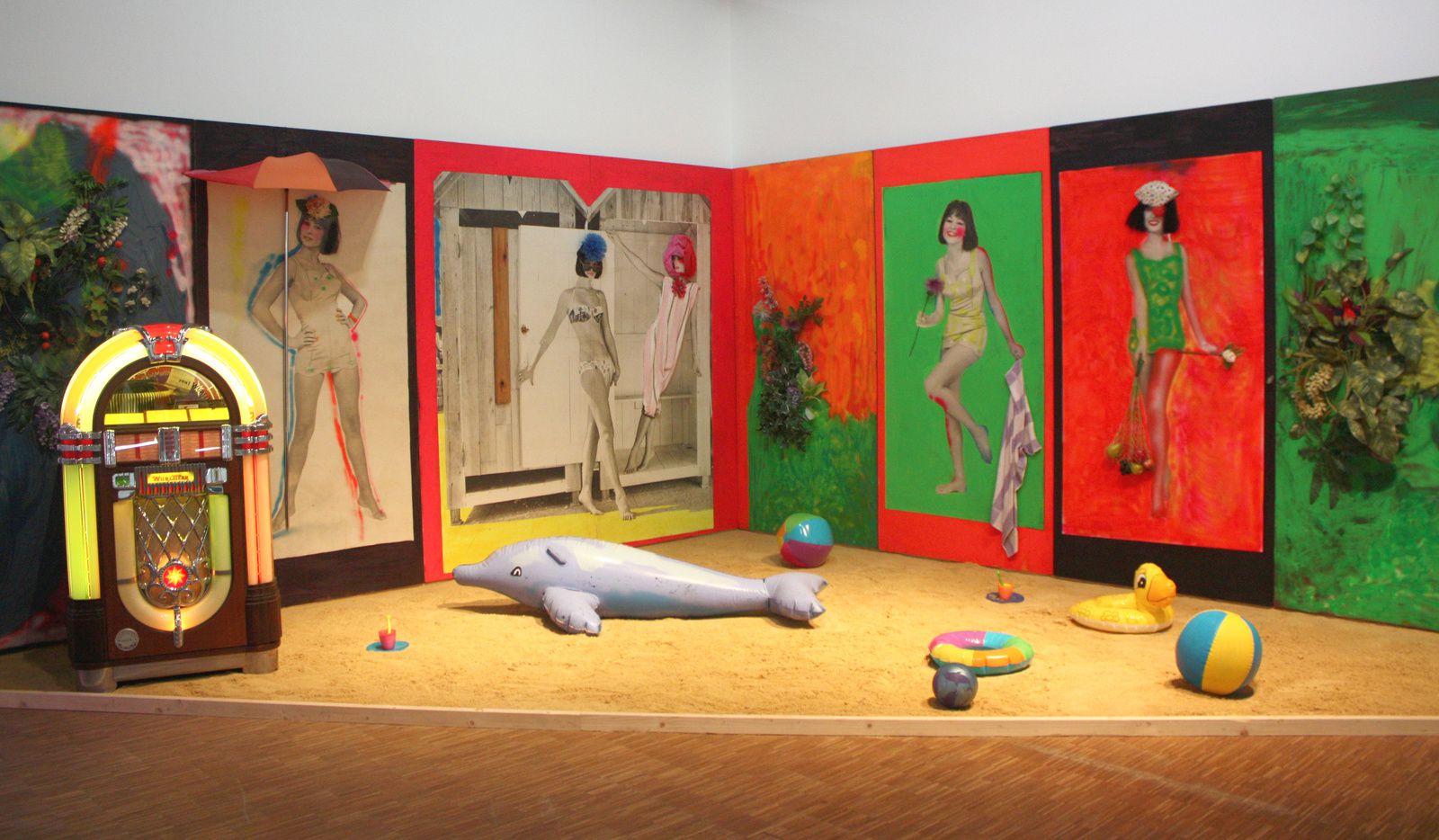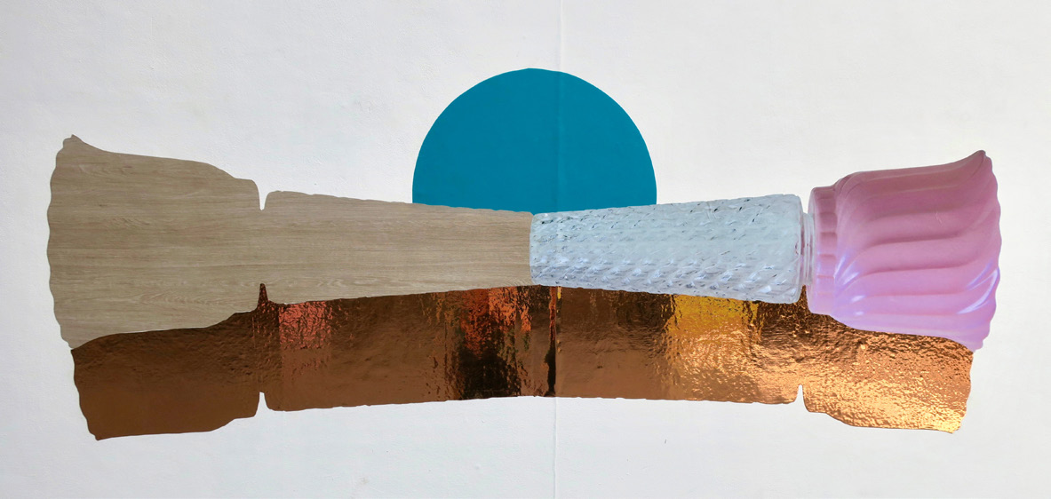 Smart à la plage, 2018, est emblématique de cette démarche. Un pied de lavabo en céramique, bleu, placé horizontalement, est prolongé symétriquement par son double en papier mâché, gris. Le tout est posé sur un socle habillé de papier vinyle de décoration, partiellement recouvert d’un aplat de peinture jaune. La partie reconstituée, symétrique de la colonne de lavabo, se comporte comme le reflet spéculaire de la pièce émaillée, un reflet dans un miroir polarisant qui lui a fait perdre sa couleur. Ce souci de symétrie se retrouve dans Coucher de soleil, 2018, installation murale, constituée de photographies d’éléments de verrerie, dévoyés de leur usage, et de papier vinyle à usage décoratif. Ces deux pièces recréent bien l’atmosphère chaude et joyeuse d’une plage estivale ensoleillée. On y retrouve l’esprit quelque peu iconoclaste des œuvres balnéaires de Martial Raysse du début des années 1960, par exemple Raysse Beach, 1962, ou Soudain l’été dernier, 1963. Chez Jeanne Cardinal, comme chez son aîné, les objets se dédoublent dans leurs images, puis se combinent avec elles, invitant le regardeur à s’interroger sur la réalité ou l’apparence des choses et de leurs représentations. Le tout dans un tourbillon ludique qui pousse à la réflexion, sans en avoir l’air…