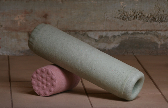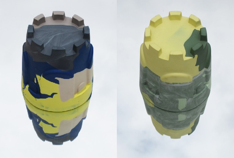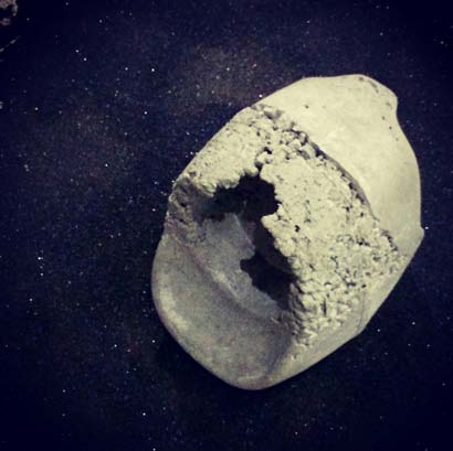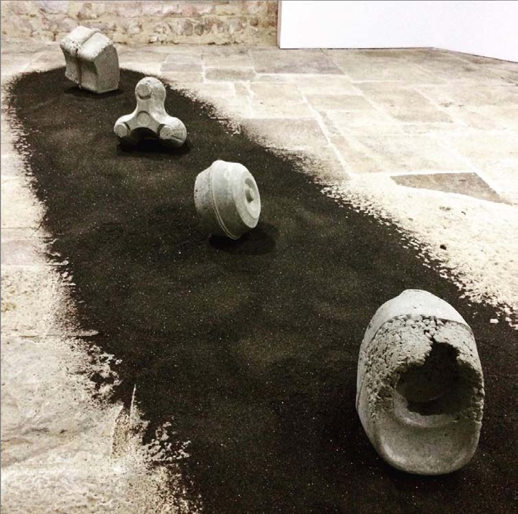 Depuis 2019, dans ses OQNI – Objets du Quotidien Non Identifiables – Jeanne Cardinal s’intéresse au vide à l’intérieur des ustensiles qu’elle récupère, à leur contretype spatial. Elle le moule en béton. Une façon de rendre visible, de matérialiser, ce qui est certes perceptible mais demeure invisible. Les œuvres résultant de ce processus de fossilisation d’objets bien contemporains mettent à l’épreuve les facultés cognitives du regardeur. Il peine – quand il y arrive – à identifier ce dont il s’agit. Quand il le peut, il prend brutalement conscience de la distorsion entre un produit du design contemporain et un aspect géologique multimillénaire. Je ne peux m’empêcher de penser au propos de Ralph Waldo Emerson, quand il écrivait : « Le langage est de la poésie fossile[4]. » Ici, chez Jeanne Cardinal, dans un processus en miroir de celui du chef de file du transcendantaliste étatsunien, le banal prosaïque se fossilise pour donner naissance à un langage poétique. Il transfuse une âme à des choses qui n’en avaient pas, faisant écho aux vers de Lamartine :