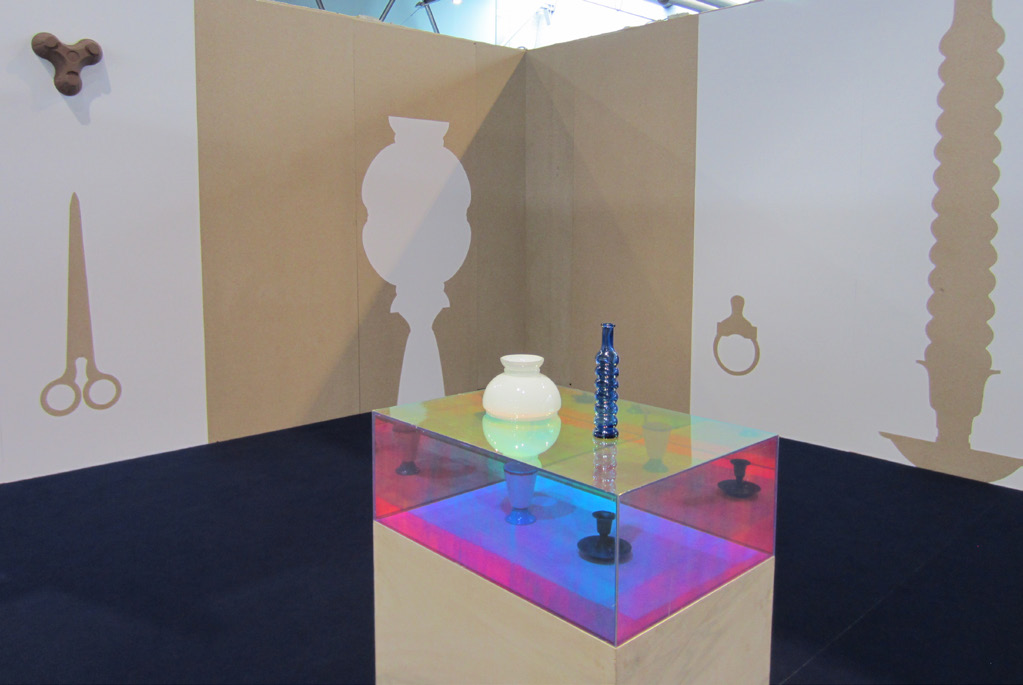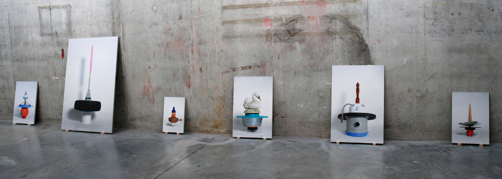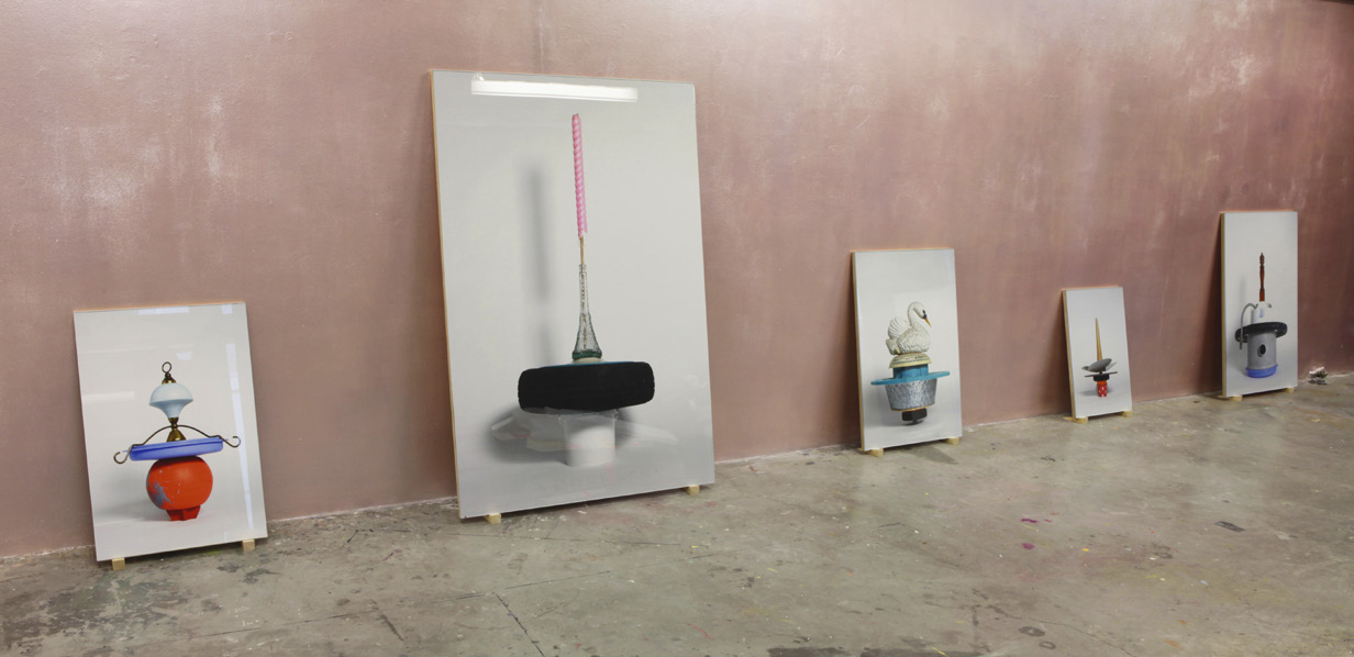 Dans Mariage d’inclination, 2019, Jeanne Cardinal juxtapose des paires d’objets de décoration, quelque peu désuets, voire franchement kitsch, en verre coloré ou en céramique, du genre de ceux que l’on trouve dans les vide-greniers, sur des décharges ou chez Emmaüs. Les regroupements s’organisent par affinités formelles. Les objets présentés sont doublés par leur silhouette – forme ou contre-forme –, souvent à l’aspect de toupie, découpée dans des planches en contreplaqué. Il se forme ainsi des couples d’objets dont la proximité dans la différence est soulignée par leurs reflets, solidifiés en bois, comme s’il s’agissait de relations amoureuses entre des humains. Pour moi, ces affinités électives font écho au roman du même titre[9] de Goethe, dans lequel l’auteur du Traité des couleurs[10] analyse et décortique les relations humaines et propose un modèle scientifique pour en expliquer la complexité. Déjà, dans Turnover, en 2016, Jeanne Cardinal avait matérialisé une première étape de ce travail sur les proximités affinitaires en mettant en scène non pas des assemblages – apparemment incongrus mais plastiquement probants – d’objets eux-mêmes mais leurs reproductions photographiques, adossées au pied d’un mur. Ici encore, un va-et-vient incessant entre l’objet et son image constitue le nœud de la réflexion de l’artiste.