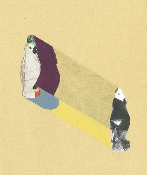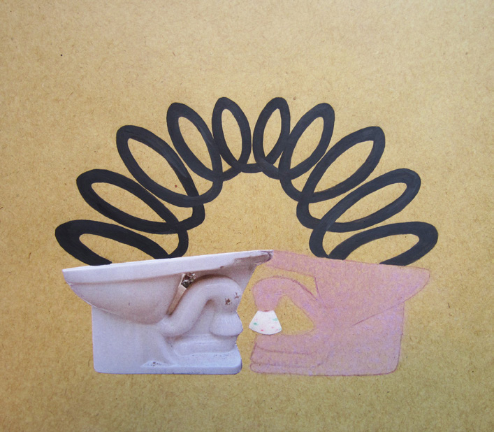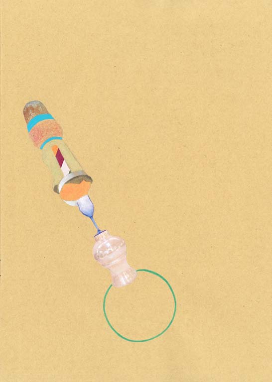 Il serait injuste de s’arrêter ici et de ne pas mentionner les réalisations graphiques de Jeanne Cardinal. Ses dessins au pastel, agrémentés ou non de collages d’images découpées, ont une dimension sculpturale qu’elle souligne elle-même : « Ma pratique du collage m’amène à libérer les objets, par le biais de l’image, de ce qui les caractérise, particulièrement de leur fonction. Je joue, j’intervertis, j’augmente, j’associe, j’imagine une composition sur la feuille comme je projetterais des sculptures dans l’espace. Quand l’incongruité des rencontres qui se fait en images me plaît, elle est souvent ensuite le point de départ d’une réflexion, d’une idée qui pourra exister en trois dimensions[11]. » Pas de différence essentielle, donc, avec sa pratique en volume. Le dessin lui donne cependant un degré de liberté supplémentaire en lui permettant de s’affranchir de la notion d’échelle et de provoquer la rencontre, pas si fortuite[12] que cela, d’objets qui n’auraient aucune possibilité de s’accoupler dans la vraie vie… Quel que soit son mode d’expression et la technique qu’elle retient, Jeanne Cardinal est donc devenue maîtresse dans l’art d’un détournement onirique qui nous réconcilie avec la banalité de notre quotidienneté.