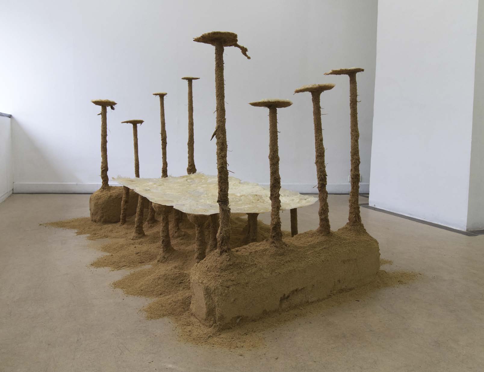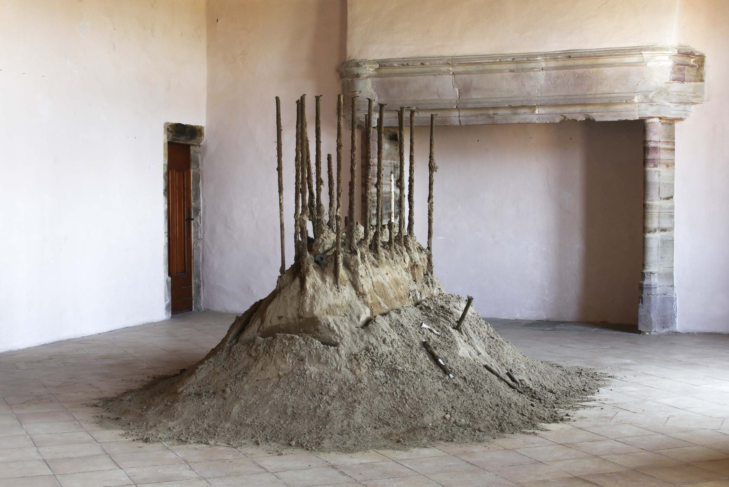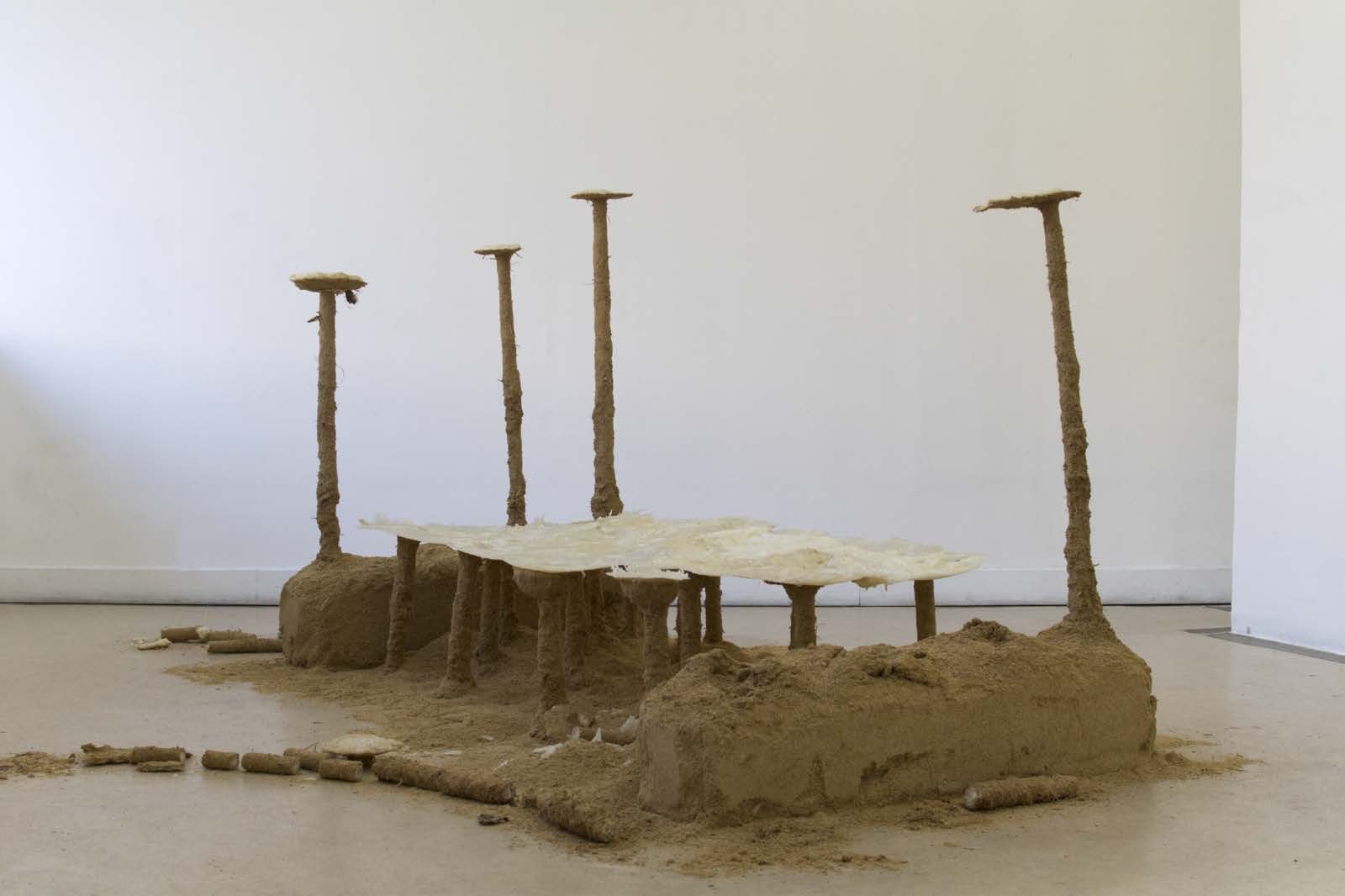 Pour réaliser Échappée du 21.07.2020, 2020, installation en sable de rivière et sucre massé, Hugo Bel a planté des tubes métalliques verticalement dans un coffrage rempli de sable. Après avoir tassé le sable, les tubes ont été délicatement retirés et du sucre liquide versé dans les espaces laissés vides. Après décoffrage, ne subsistent que des colonnes de sucre d’une grande fragilité, émergeant d’un monticule de sable, comme d’improbables stalagmites. Cette œuvre était vouée à une rapide disparition du fait de l’instabilité du sable, de son humidité qui fait fondre le sucre et des mouvements des visiteurs. Elle demeure cependant, à travers ses photographies et la description du protocole de sa réalisation, un monument, au sens initial de ce terme : un objet qui atteste l’existence, la réalité de quelque chose et qui peut servir de témoignage.
