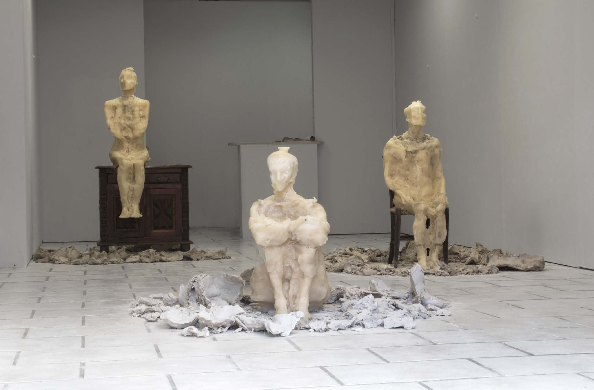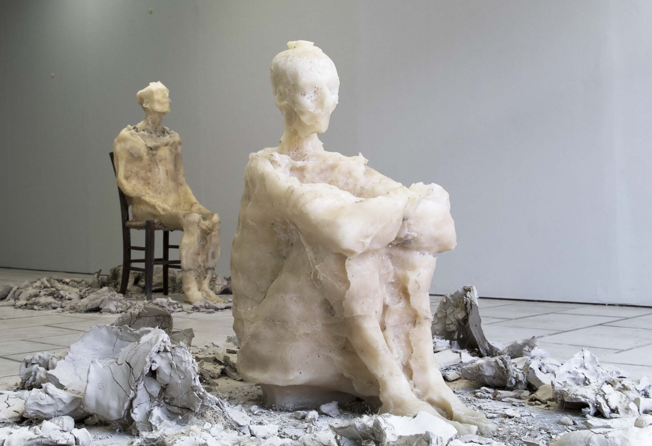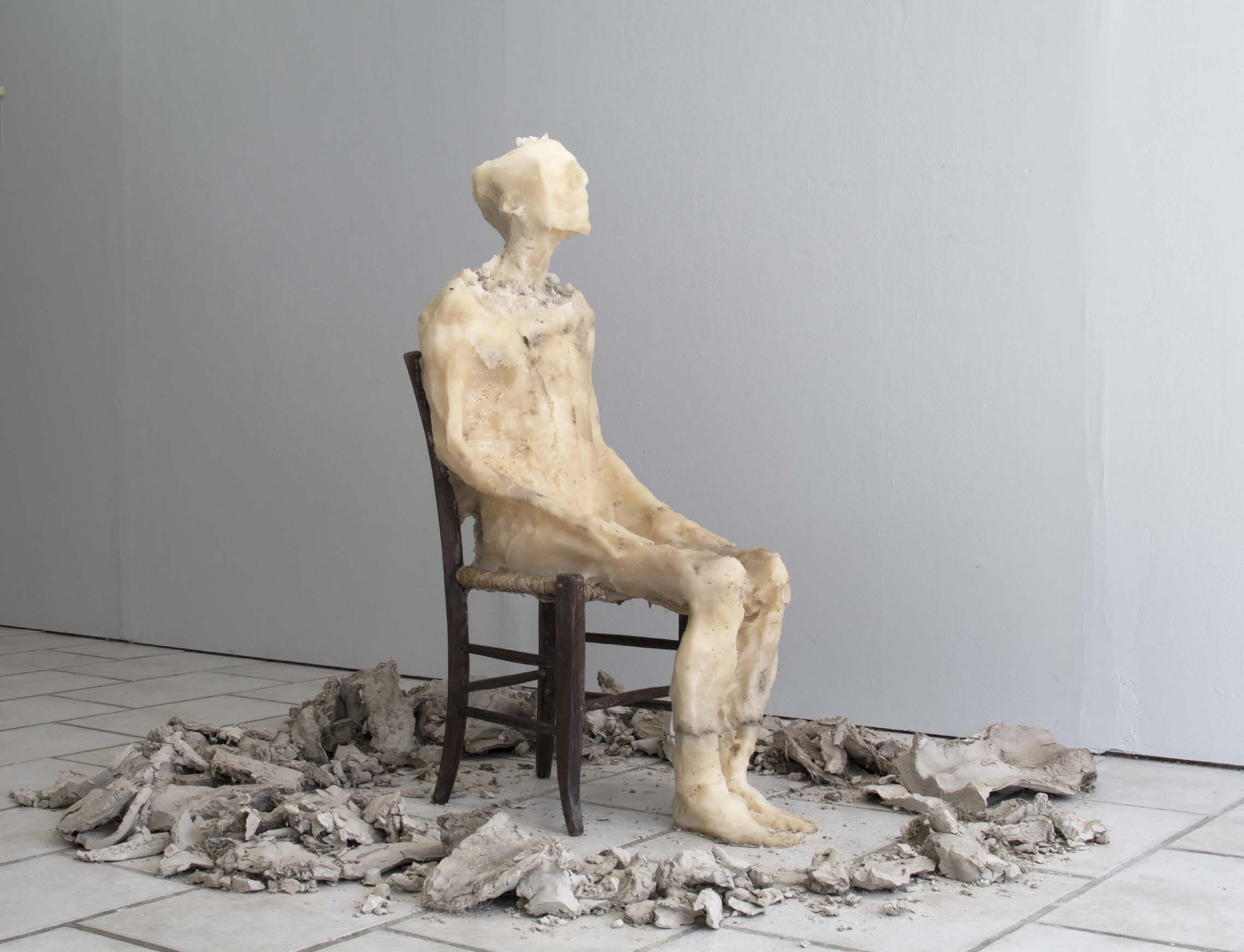 En novembre 2020, lors de la session d’automne de macparis, Hugo Bel présentait une de ses rares œuvres transportable, bien que fragile et, elle aussi, inéluctablement vouée à la disparition. Son Paysage scénique #3 est constitué de trois sculptures en sucre massé, réalisées à partir de moulages en argile sur des modèles vivants, l’un accroupi au sol, le deuxième assis sur une chaise, le dernier sur un bahut, le sol étant jonché des débris des moules en terre. Au premier abord, le spectateur pense que les personnages, figés, fixant un horizon insaisissable, sont réalisés en cire, en stéarine ou en paraffine. Une analyse plus poussée le laisse dubitatif, surtout du fait des irrégularités de la surface, constellée de bulles, de cloques, de petites cavernes et de manques de matière… Ce n’est qu’à la lecture du cartel que la vérité s’impose, non sans mal, d’ailleurs, car l’idée du recours à du sucre de betterave dans les arts plastiques ne va vraiment pas de soi… Ce qui me frappe, dans ces œuvres, c’est la confrontation d’un processus très ancien, maîtrisé, et donnant des résultats prévisibles et durables, avec la volonté d’y introduire une dimension aléatoire, un risque et un degré d’imprévisibilité du résultat. Tout pousse à croire que, pour Hugo Bel, le procédé prime sur le résultat, considéré comme la trace d’une activité plutôt que comme une fin en soi. Le créateur met son ego entre parenthèses pour laisser le processus se dérouler, avec les accidents qui lui sont inhérents. On pense au travail du poète décrit par René Char : « Un poète doit laisser des traces de son passage, non des preuves. Seules les traces font rêver[8]. » Et ces traces ne peuvent pas perdurer car, comme le déclare Jacques Derrida, « Une trace ineffaçable n’est pas une trace[9]. »