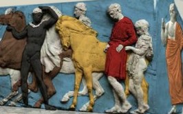 Dans cette même exposition, l’artiste montrait quelques bustes réalisés selon un procédé identique et présentés sur des étagères, comme dans une très sérieuse glyptothèque. À bien les observer, ainsi que ses autres œuvres en volume, on se rend compte que la démarche d’Hugo Bel est triplement transgressive. 1. Tout d’abord, la sculpture a toujours visé à une forme de pérennité, même si sa perception et le jugement esthétique porté sur elle a évolué dans le temps. Ainsi, les chefs-d’œuvre de la statuaire grecque que nous admirons dans nos musées étaient, à l’origine, peints de couleurs vives que nous jugerions très kitsch avec les critères de jugement d’aujourd’hui. Imaginons la Vénus de Milo, avec ses bras, peinte de façon naturaliste et couverte de parures et de bijoux, ou les frises du Parthénon coloriées comme une succession de cases d’une bande dessinée de notre époque… 2. Ensuite, le moulage sur nature a longtemps été considéré comme relevant de l’artisanat et non de la pratique artistique. On se souviendra du scandale provoqué par la sculpture d’Auguste Clésinger Femme piquée par un serpent, 1847, qui avait utilisé un moulage sur nature du corps d’une femme, d’une demi-mondaine[10], de surcroît, pour la réaliser… 3. Enfin, la qualité de la surface et de sa patine ont longtemps eu une importance cruciale dans la sculpture. Hugo Bel n’y attache aucune importance, préférant mettre en évidence les aléas de la création de l’œuvre, sans y apporter la moindre correction…