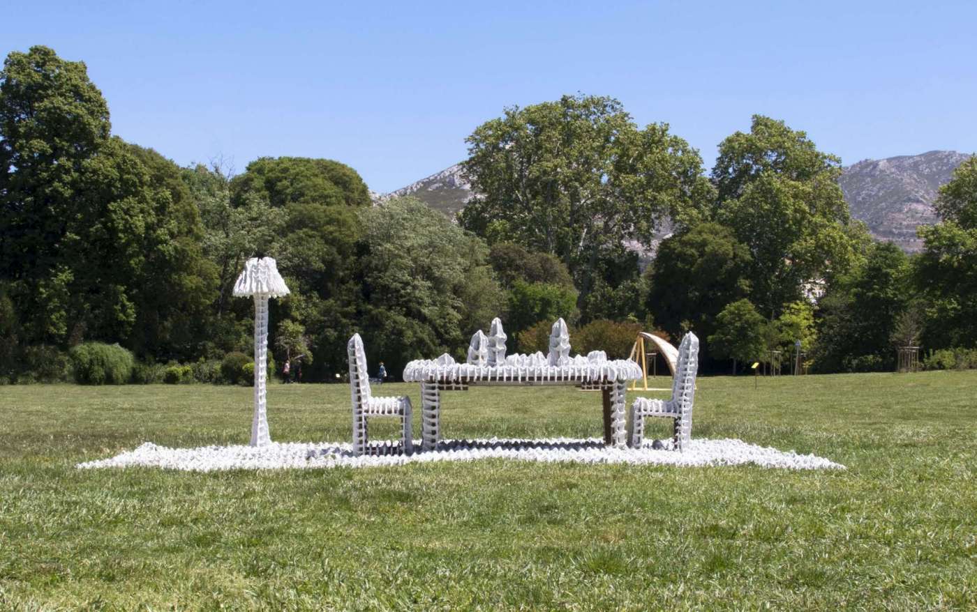 Le Paysage scénique #2 – Le déjeuner sur l’herbe, 2021, se présentait comme des meubles – table, chaises, lampadaire – et des éléments d’un service de table recouverts d’un maillage de plâtre blanc déposé, comme une meringue avant cuisson, avec une poche à douille. Le tout situé en extérieur, donc soumis aux rigueurs climatiques. Toute présence humaine y était fossilisée pour laisser place au silence de l’absence, à une mise entre parenthèses de toute activité humaine, à une cristallisation du temps…