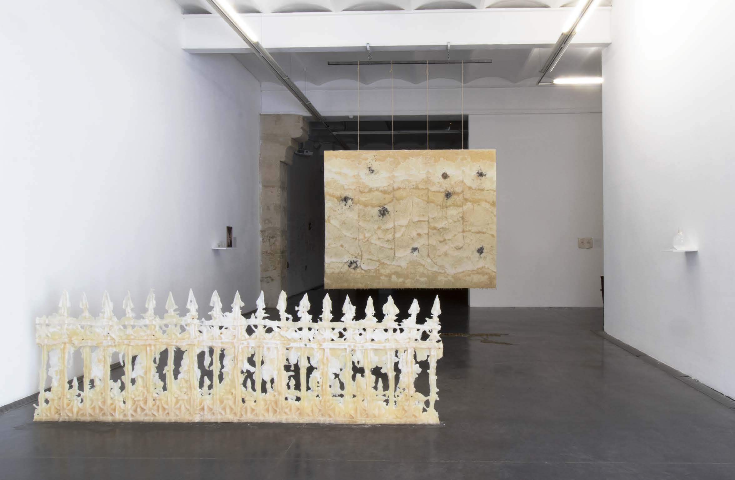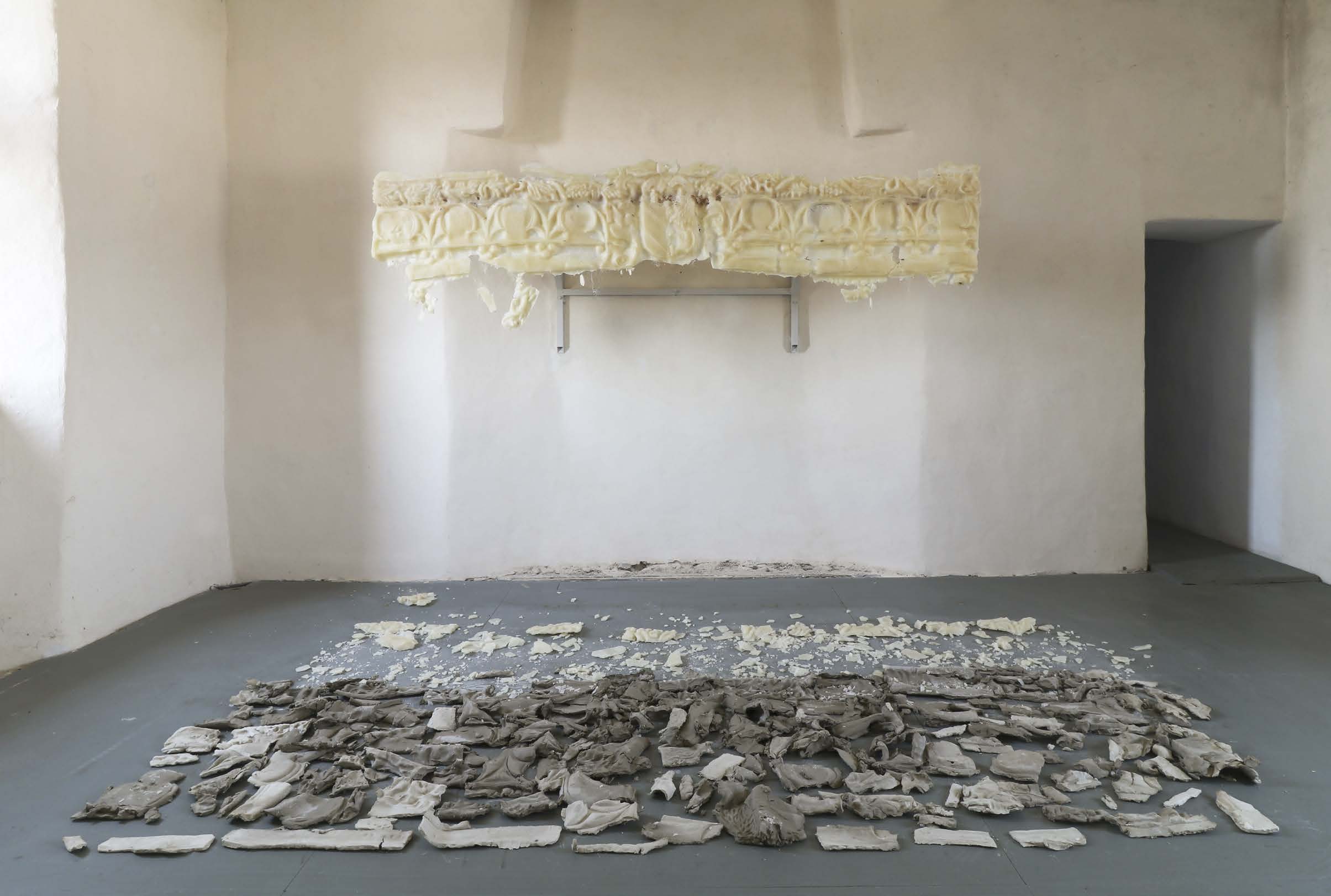 La dimension mémorielle, que nous venons d’évoquer, est aussi souvent présente dans les œuvres d’Hugo Bel. Par exemple, Emprunt de mémoire, 2020, est une installation in situ réalisée en sucre à partir du moulage d’un linteau de cheminée, lui-même moulage d’un original déplacé en un autre lieu. L’artiste a procédé par estampage sur des plaques d’argile, lesquelles se sont brisées lors du processus de coulage du sucre. Leurs débris sont présentés devant la pièce, pour marquer l’étape ultime d’une succession d’opérations étalées sur plusieurs siècles : de l’original à sa copie, de la copie à sa version en sucre, de cette production à son immanquable disparition…