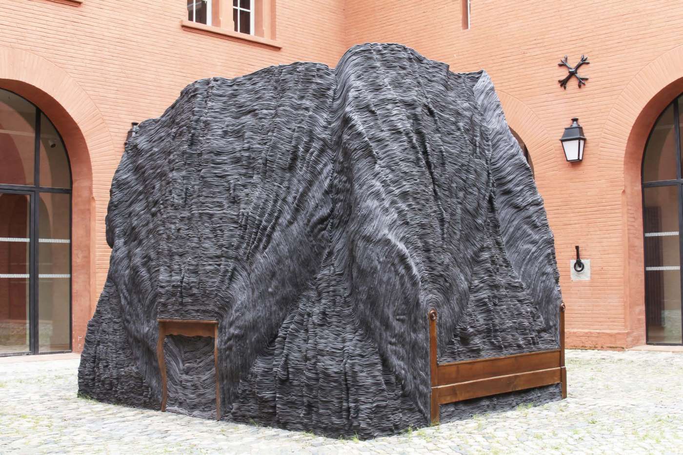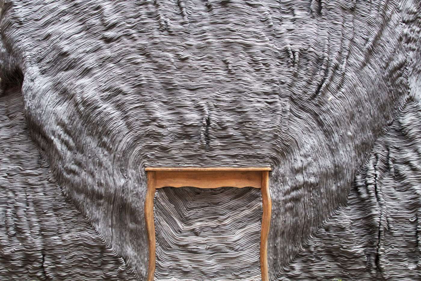 Plus récemment, au printemps 2022, lors de son exposition personnelle dans la galerie Lou Carter, à Paris, Hugo Bel proposait une variation, de dimensions réduites, de son Paysage Mental, 2021, pensé pour la cour centrale du Castelet, ancienne prison Saint-Michel de Toulouse. Cette pièce monumentale quadrangulaire se présente comme une sorte de mastaba gris et noir dont les entrées auraient été occultées par des meubles en bois, affleurant à la surface de la construction. Les parois sont constituées de boudins de plâtre naturel teinté – on pourrait penser aux colombins des céramistes – extrudés à l’aide d’une poche à douille et superposés. Leurs lignes sinueuses confèrent aux quatre murs extérieurs un aspect mouvant, comme la trace des ondes créées par une pierre jetée dans une mare, mais aussi au caractère statique de coulées de lave refroidie. Le regardeur ne peut s’empêcher de projeter son imagination vers l’intérieur de cette structure qui fait écho aux cellules occupées, autrefois, par les prisonniers. Comme s’il s’agissait de contrebalancer cette sensation, les meubles domestiques désuets, prisonniers de la masse sombre et partiellement visibles, évoquent des souvenirs personnels qui permettent d’affranchir la pensée d’une vision trop étriquée, carcérale, de notre environnement.