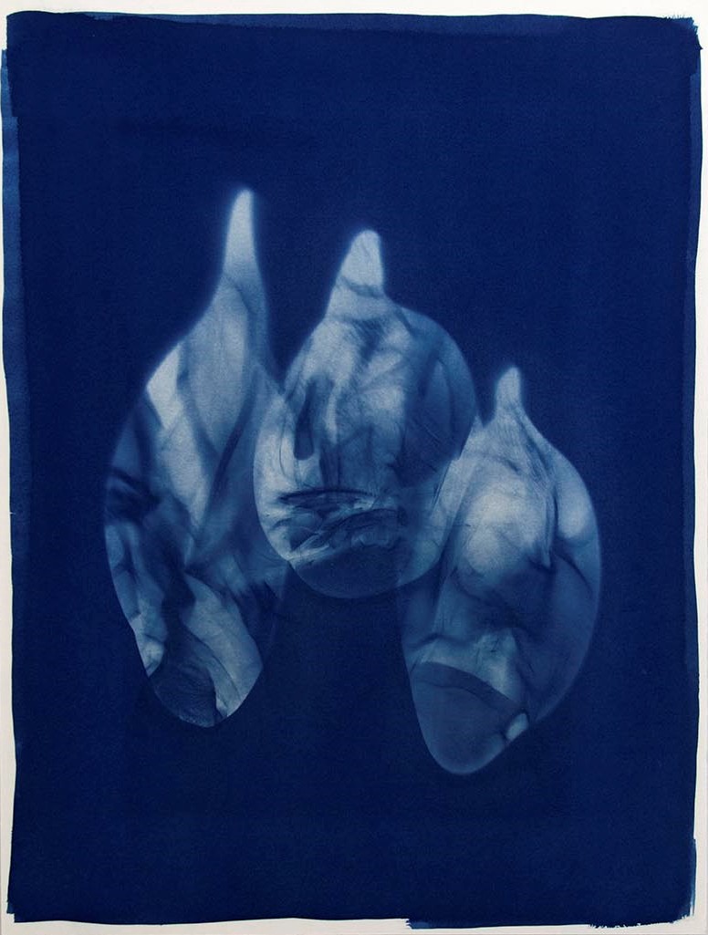 Dans cette même exposition, Hugo Bel présentait, encadrées, de fines plaques de plâtre dont la vision suscitait un malaise chez le spectateur, conscient de leur fragilité et du caractère dérisoire d’une telle production, incapable de résister au moindre choc… Toujours cette impermanence au cœur de son travail plastique, y compris dans ses productions en deux dimensions… On pourrait dire de même de ses cyanotypes sur papier, Le merveilleux est dans le quotidien, 2021, réalisés à partir de l’ombre portée par des verres soufflés : fragilité du verre, fugacité de l’ombre, dépendance de réactions chimiques, souvent imprévisibles, entre ombre et lumière… « Seul l’éphémère dure[12]. » aurait déclaré Eugène Ionesco en 1962. Il y a bien, dans les œuvres d’Hugo Bel cette dose de théâtre de l’absurde cher à l’auteur de La Cantatrice chauve…