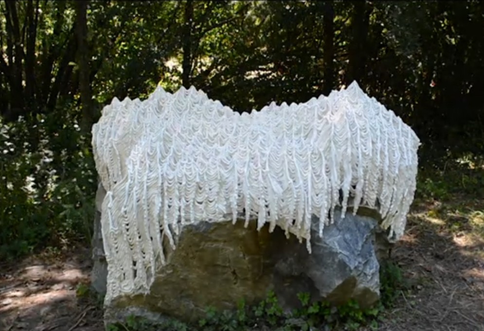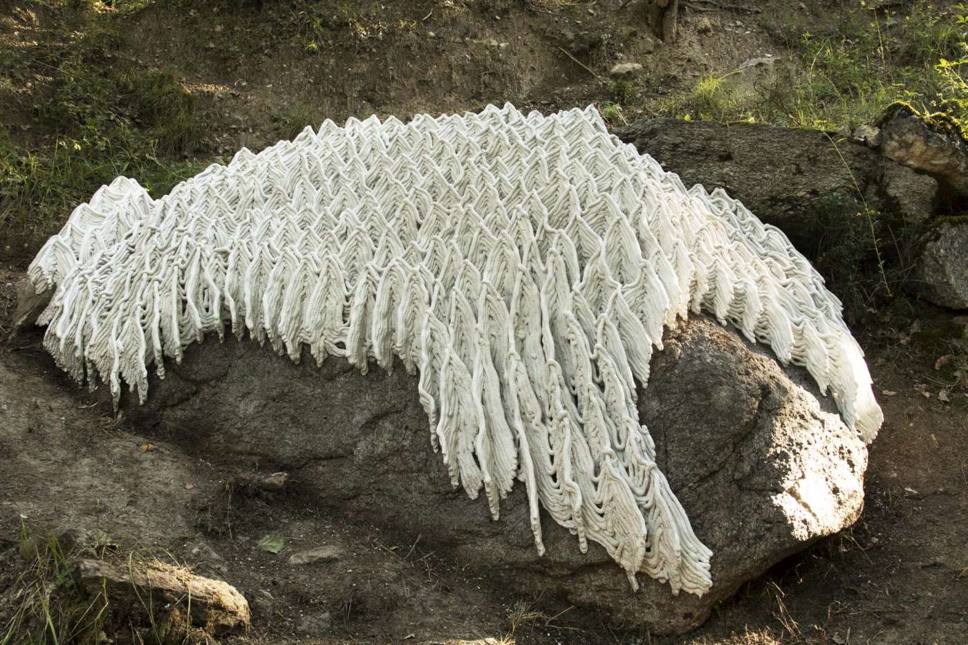 De façon paradoxale chez un artiste pour lequel le processus prime sur le sujet et sur l’objet, Hugo Bel ne dédaigne pas la nature. Il s’en revendique même. On a vu que le barreaudage du lit de Stalker se présentait comme une structure végétale. Ailleurs, dans Gangue, 2018, installée en plein air, il recouvre partiellement d’une dentelle de plâtre naturel un bloc de moraine glaciaire, comme s’il s’agissait d’une pierre précieuse. L’écrin, initialement blanc, changera de couleur, puis se délitera et disparaîtra, redonnant au bloc érodé son aspect initial. Il en est de même pour Promenons-nous dans les bois, 2020, habillant un bloc de pierre anguleux.