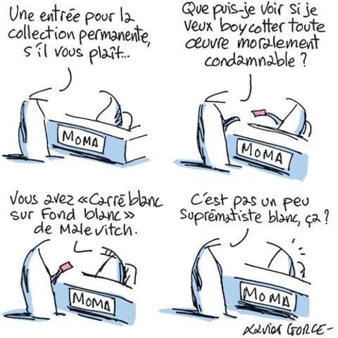 Pour terminer sur un aspect plus souriant, je pense à un des dessins des Indégivrables de Xavier Gorce qui ridiculise la dictature moralisatrice se muant en censure :