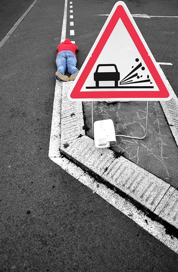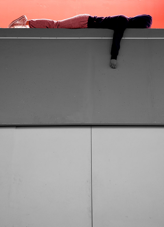 Chez Françoise Peslherbe, les structures impersonnelles en béton, acier ou asphalte, la signalisation routière, le mobilier urbain deviennent éléments d’un monde irrationnel dans lequel des personnages colorés jouent une partition imprévue, se prêtent à des jeux apparemment futiles, mais avec l’application et le sérieux propres aux grands projets. Ses acteurs apportent une touche acidulée, inattendue et décalée, à la grisaille ambiante, entrouvrant ainsi la porte vers d’autres façons de regarder notre environnement. Et ceci, non sans une certaine poésie nostalgique, comme dans Coucher de soleil en ville, 2012, où un étagement vertical de plages neutres, fragments de façades en béton, sert de piédestal à un sujet allongé sur le ventre dans les rayons d’un soleil couchant. À sa manière, notre photographe transforme la banalité de lieux réels – connus ou familiers, même si on n’y fait assez peu attention – en cadres de récits fictionnels dont les multiples lectures potentielles restent ouvertes, laissées à la libre interprétation du regardeur. Elle nous suggère des débuts d’histoires. À nous de les développer et de les mener à leur terme.