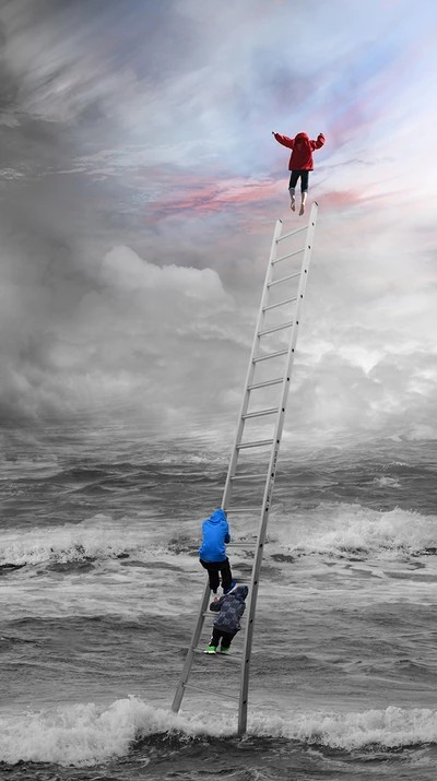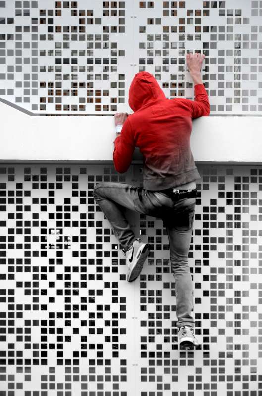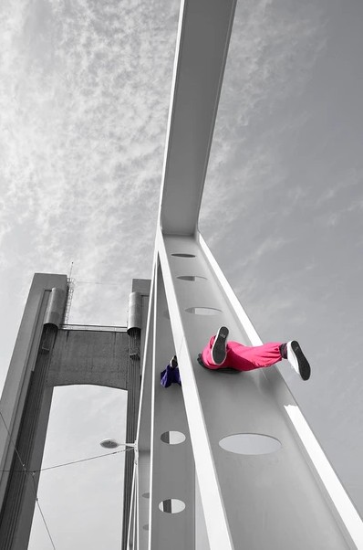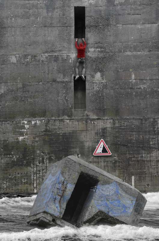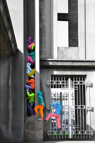 Le mouvement ascensionnel qui figure dans certaines des propositions de Françoise Peslherbe illustre bien cette volonté d’inciter le regardeur à se projeter vers un ailleurs potentiellement meilleur. Ainsi Les aléas de la vie, 2017, montre une immense et improbable échelle, sortie d’une mer agitée, escaladée par trois personnages colorés dont le dernier, au sommet, semble, tel un nouvel Icare, se jeter dans le vide pour prendre son essor. Dans Se compliquer la vie, 2018, un homme s’agrippe à une paroi en béton, en bord de mer, avec un fragment de blockhaus à ses pieds et, de façon ironique, un panneau signalétique coloré indiquant un risque de chute de pierres. Pour Accro aux pixels, 2018, un jeune encagoulé, montré de dos, escalade un mur mosaïqué dont les motifs évoquent les détails infiniment agrandis d’une photographie en noir et blanc : mise en abîme de la technique photographique et en péril de l’intrépide alpiniste occasionnel. L’ascension professionnelle, 2012, est plus ludique et ironique, sarcastique, même, en mettant en scène une série de jeunes gens aux vêtements flashy en train de créer, comme par effraction, une colonne humaine dans la gaine technique en béton d’un immeuble dont l’entrée est interdite par une forte grille cadenassée.