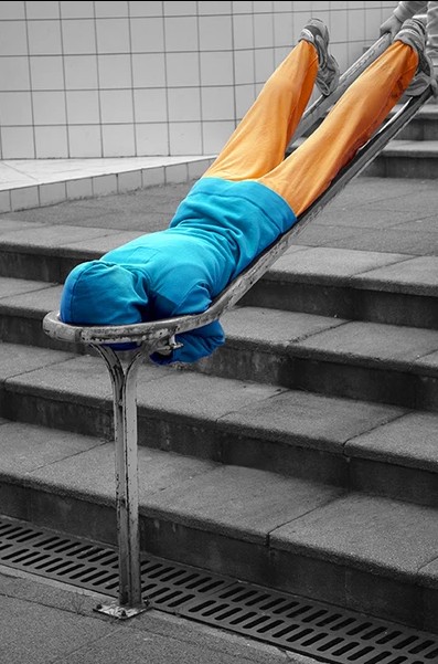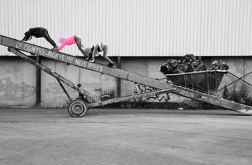 Cette dernière œuvre illustre la propension de Françoise Peslherbe à illustrer, de façon critique et au pied de la lettre, certaines expressions ou des dictons. Dans Métro, boulot, dodo, 2011 elle présente un jeune, en jogging bleu et jaune, allongé penché vers l’avant, face vers le sol, sur une rampe d’accès à une station de métro, sa tête encapuchonnée logée dans une boucle du rail de la balustrade. Tri sélectif, 2012 aligne, en noir et blanc, cinq poubelles devant la façade d’un magasin délabré, aux vitres brisées. Devant celle de gauche des corps enchevêtrés, vêtus de couleurs criardes, semblent destinés à partir dans la benne à ordures. Au cas où en douterait, l’inscription jeunes en péril, au pochoir sur le mur en briques, nous ramènerait à la réalité du propos. Pour La tête dans les nuages, 2014 – une vue en contreplongée de la structure métallique d’un pont suspendu, se perdant dans les nuages –, Françoise Peslherbe fait apparaître les jambes et les pieds d’un protagoniste coincé dans un des orifices des poutrelles métalliques. Avec La vie en pointillés, 2014, c’est un corps allongé sur le ventre, dans le prolongement d’une double ligne de circulation, qui nous est présenté. On craint pour la vie du sujet, mais le panneau signalétique, au premier plan, ne met en garde, de façon dérisoire, que contre le risque d’éventuelles projections de graviers. Toutes ces intentions de remise en cause des certitudes établies me semblent résumées dans Le contre-poids de nos idées, 2016. Trois personnages arc-boutés sur une bascule de fortune y tentent de contrebalancer la masse d’une benne de déchets industriels.